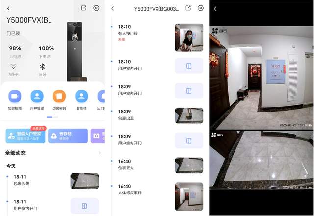 既然是智能门锁自然也可以连接手机APP,萤石启明Y5000FVX用的是萤石云生态,连上以后可以实时看到门锁状态,包括开门人员、开门方式、时间、人体感应事件等等,让我们轻松掌握每天门前的情况。也能随时查看视频,即使在千里之外也能看到门前实时图像。另外也支持访客密码和远程开门,可以设立临时密码,有亲戚朋友来的时候,设置一个临时密码,还能设置临时密码有效时间,避免录入人脸或者日后删掉验证的尴尬。远程开门功能也能通过远程通话功能给快递员等开门,这样快递可以直接放到家里,还无需透露个人信息。