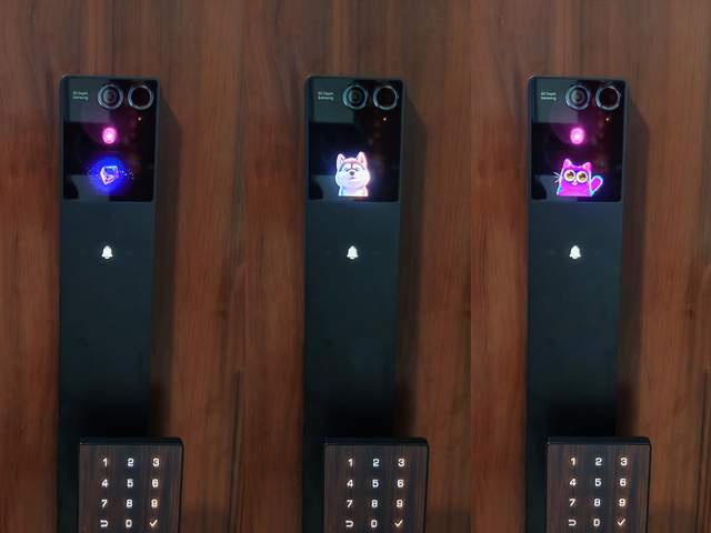 安装以后上门的实际效果也的确很惊艳,除了锁体带来的质感外,它还拥有前后两块屏幕,外门面板上是一块2.13英寸的AMOLED互动屏幕,主要是用来显示AI智能体以及人脸识别时的辅助认证,分辨率达到了502*410,也就是说PPI达到了304,比手机还高,显示效果十分细腻,上锁解锁的时候配合语音与形象,一眼就能看出它与其他锁的不同。