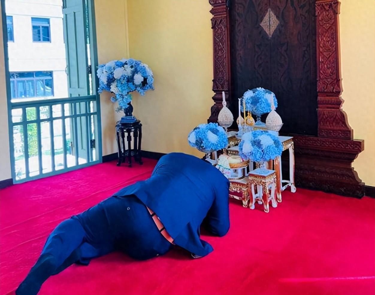 二王子现身皇家陵园的时候,恭恭敬敬跪拜普密蓬国王,匍匐跪拜礼的确很标准。看来虽然离开王室已经二十七年,但是二王子的仪容仪态并没有退步,还是保持很高的水准。