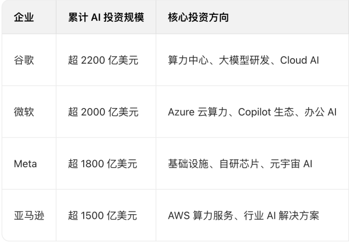 过去两年,全球科技巨头在 AI领域的累计投资超8000亿美元,其中60%以上流向算力中心、芯片采购等重资产领域。
