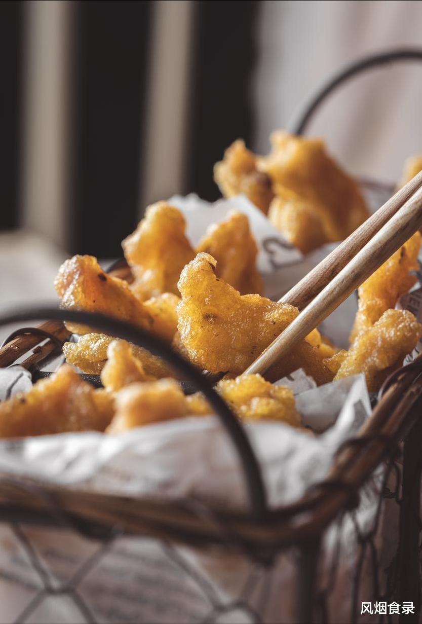 六成油温炸至金黄,再复炸至酥脆。