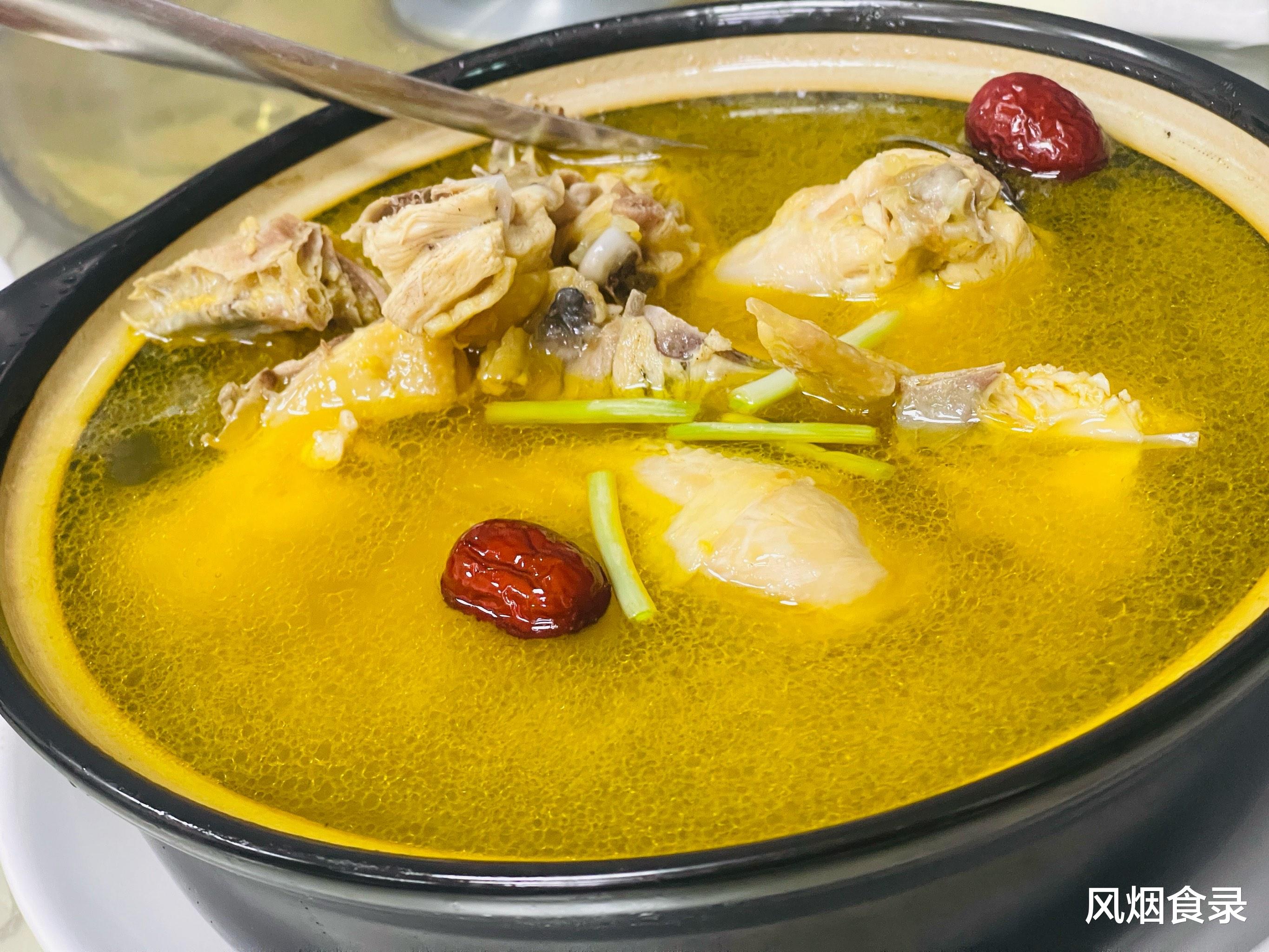 火慢炖两小时,汤汁金黄透亮,鸡油浮面,鲜味直窜鼻腔,