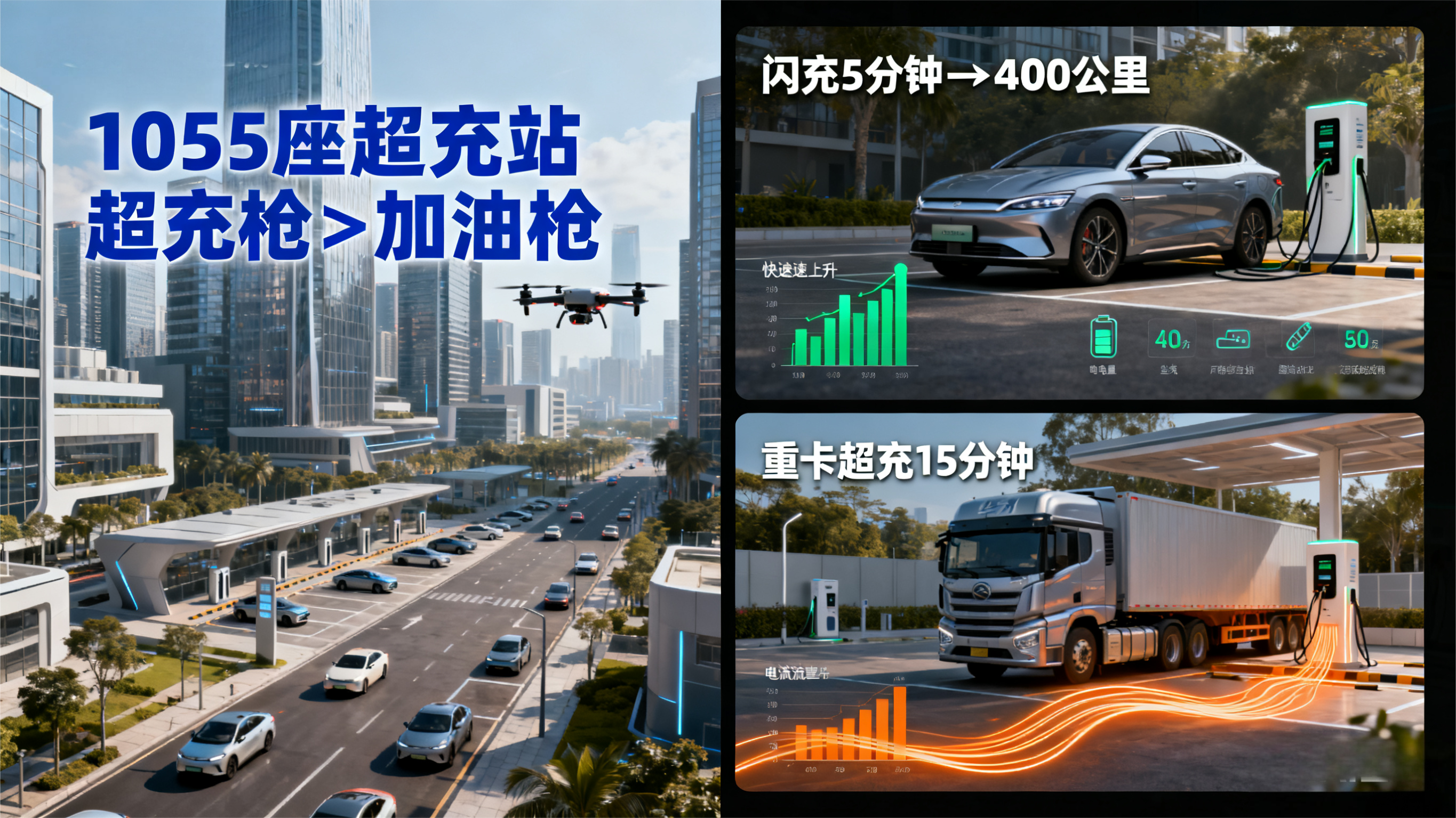 目前,全市已建成投用超充站1055座,在全球率先实现超充站、充电枪数量全面超过加油站、加油枪。