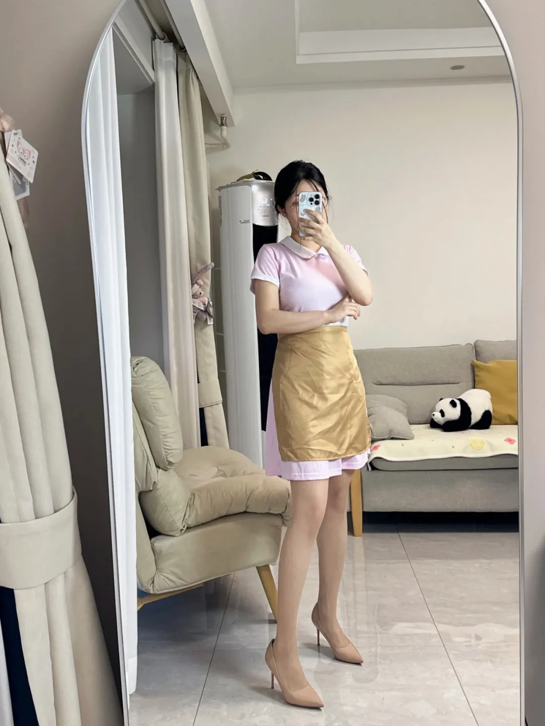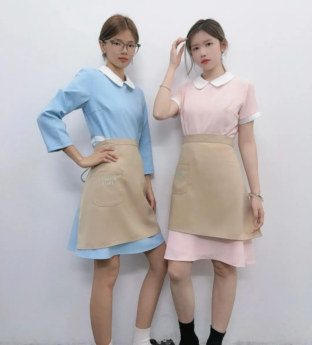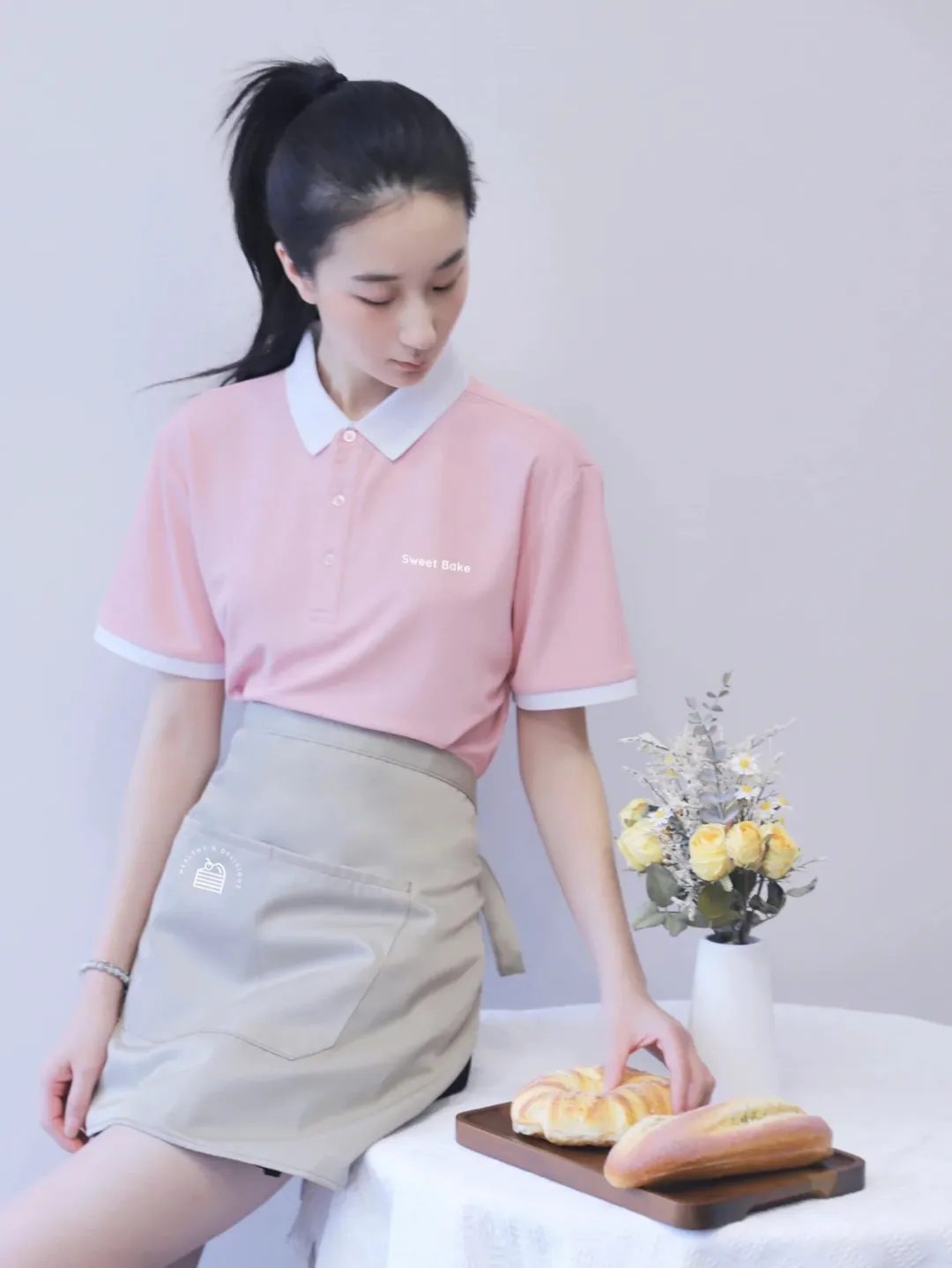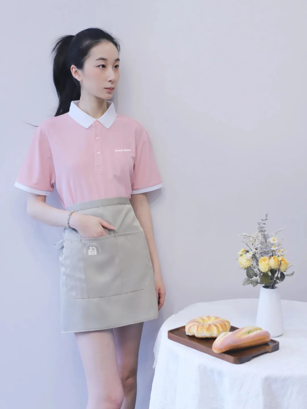粉色制服,则是午后的蜜桃汽水色。不艳不俗,是加了奶白色调的柔粉,像初绽的樱花瓣沾染了三分月光,又像婴儿脸颊上泛起的娇嫩红晕,天生带着治愈的磁场。同样的翻领与七分袖设计,在粉色的底色上显出别样韵味:白色衬衫领口如同给柔和的粉勾了金边,清冽又温柔;七分袖露出的腕部肌肤,被粉色衬得宛如凝脂,连举手投足都像蜜桃表面浮动的绒毛,柔软得能掐出水来。粉色半身裙的裙摆比浅蓝款更显娇俏,收腰的设计不经意勾勒出穿制服者的美好身段,行走时裙角轻颤,像一片花瓣在风里打了个旋,带着点少女般的羞涩与期待。系上卡其色围裙后,颜色对比反而更显柔和——围裙口袋上“好利来”三个棕色布贴字,圆润如孩童笔迹,像给蜜桃汽水里丢进一颗甜饼干,瞬间激活了活泼的童趣;帆布的粗粝质感与粉色的柔软相碰撞,竟奇妙地调和出“专业与温柔并存”的氛围,既像能端稳托盘的可靠伙伴,又像能倾听心事的邻家姐姐。