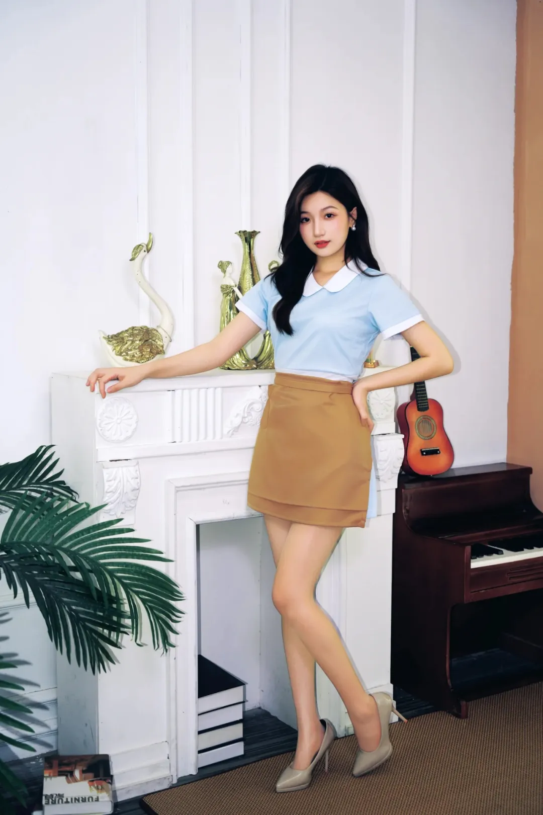 浅蓝的那一套,是被阳光晒淡的天空色。蓝得极淡,像春雨过后澄澈的天光,又像薄薄的海沫铺在沙岸上,没有半分沉郁,反而透出水洗过的清亮。面料是棉麻混纺的质地,肌理细密如初春的风,触肤的瞬间能想象到微风拂过脸颊的轻柔。翻领设计利落得很,露出内搭白色衬衫的领口,那道干净的白边如同给浅蓝镶了细框,既保留了文艺的疏朗感,又因制服的版型多了份利落——A字半身裙恰到好处地收住线条,行走时裙摆轻轻摆动,像湖面被风揉出的浅纹,端庄里藏着流动的韵律。卡其色围裙是点睛之笔,帆布材质厚实耐磨,贴袋上的“Holiland”刺绣是手写体,弧度温柔如月下情书的落款;这抹大地色系的加入,恰似给清朗的天空接上厚实的土壤,让浅蓝的轻盈瞬间落地,变成了可靠与温存的平衡。