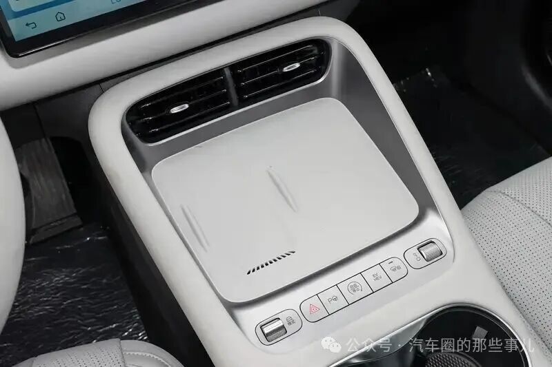 储物空间方面,前排中控台底部配置了两个开放式的手机槽,左侧还带有无线充电和通风降温功能。后方的杯架带有限位器,大小适中。前排的中央扶手下面是冰箱,冷热皆宜,方便出行储存饮品。