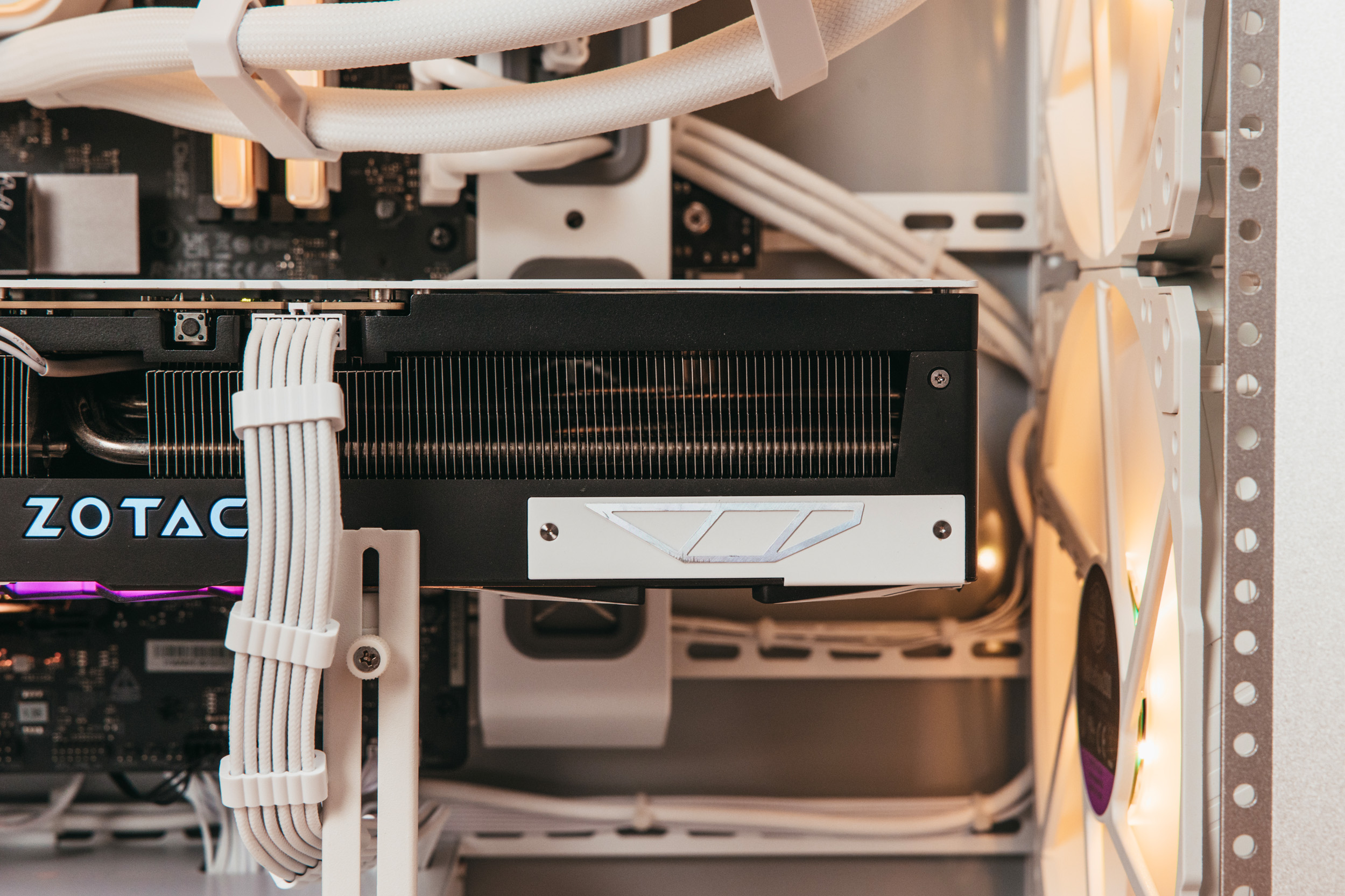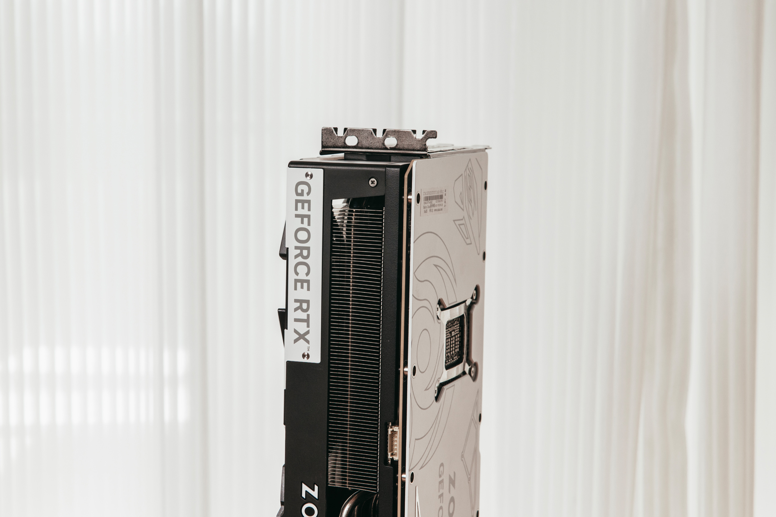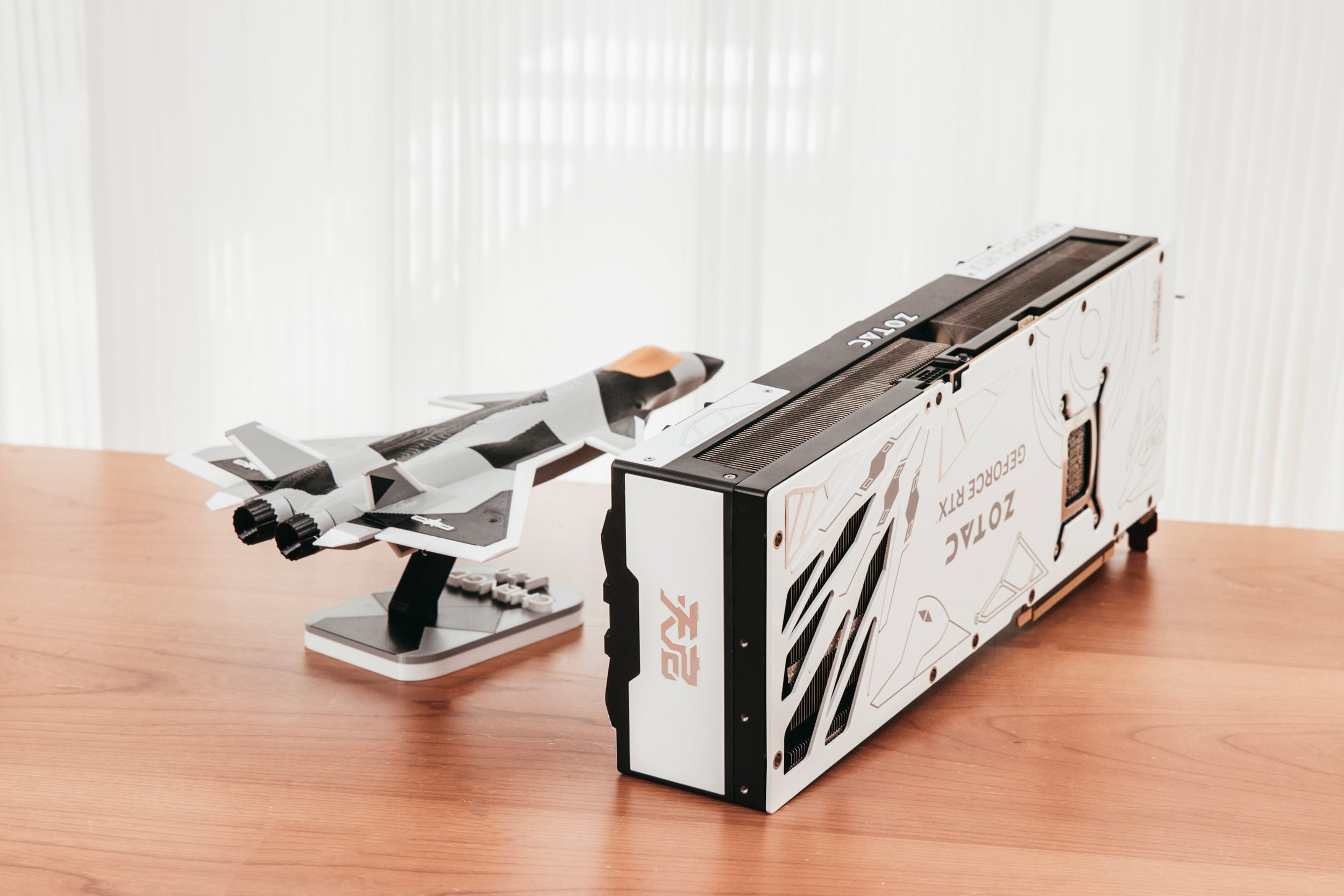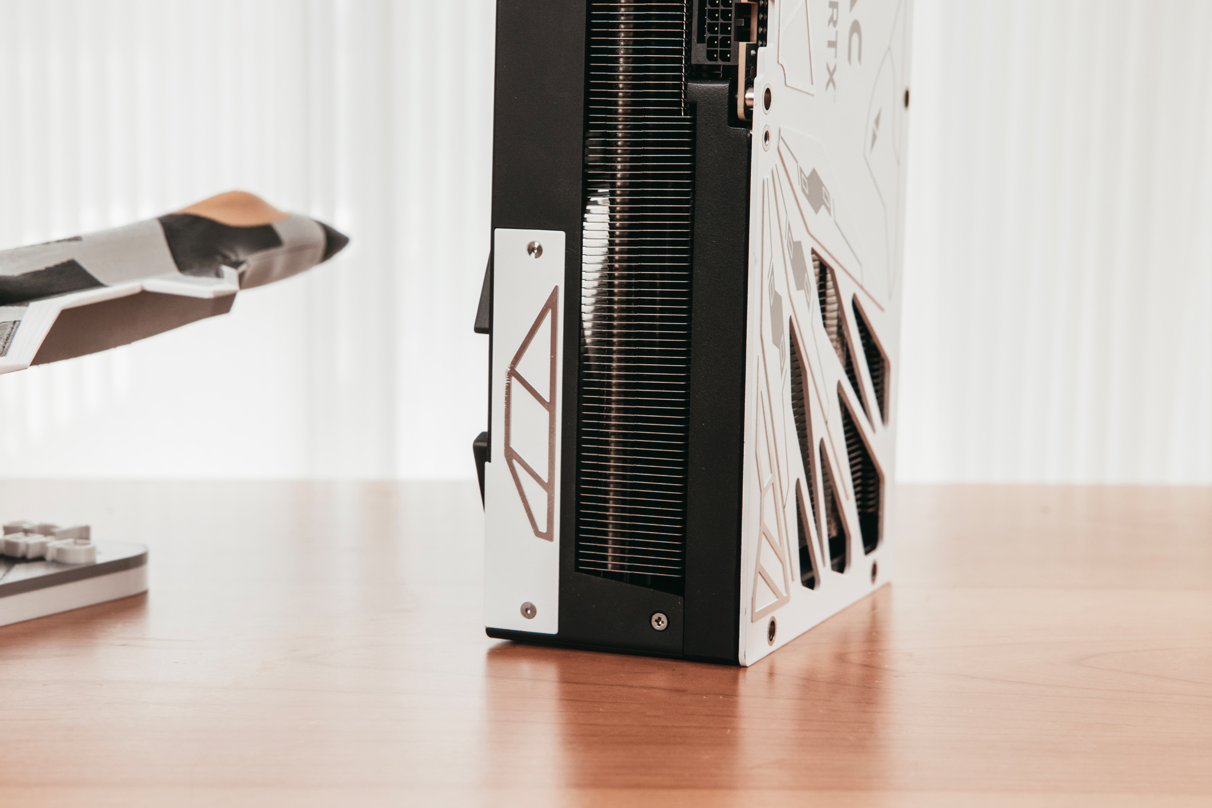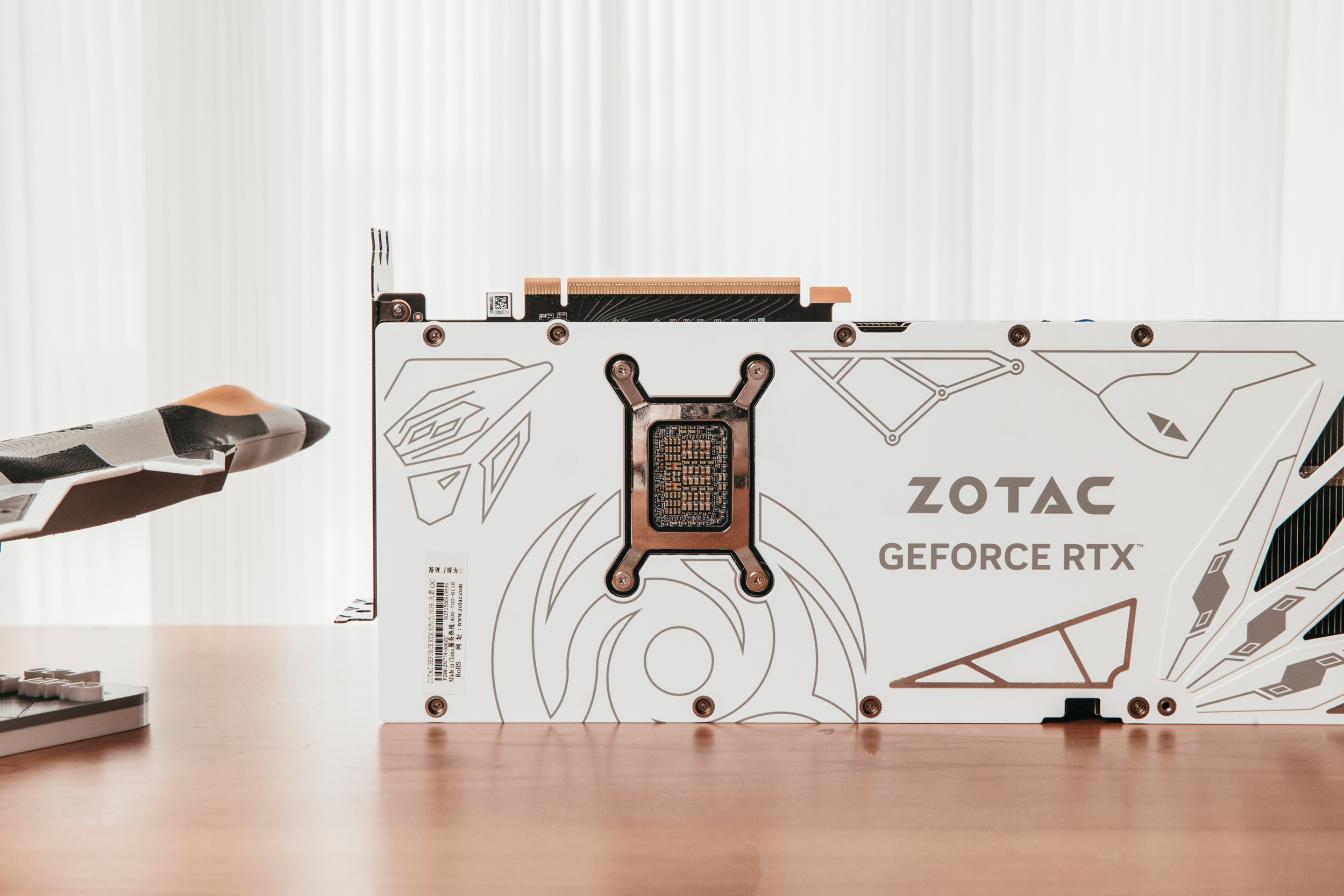 显卡俯瞰视角,可以看到纯白背板的丰富元素。
