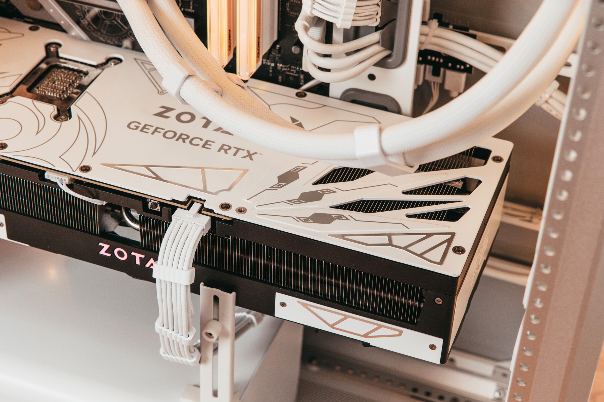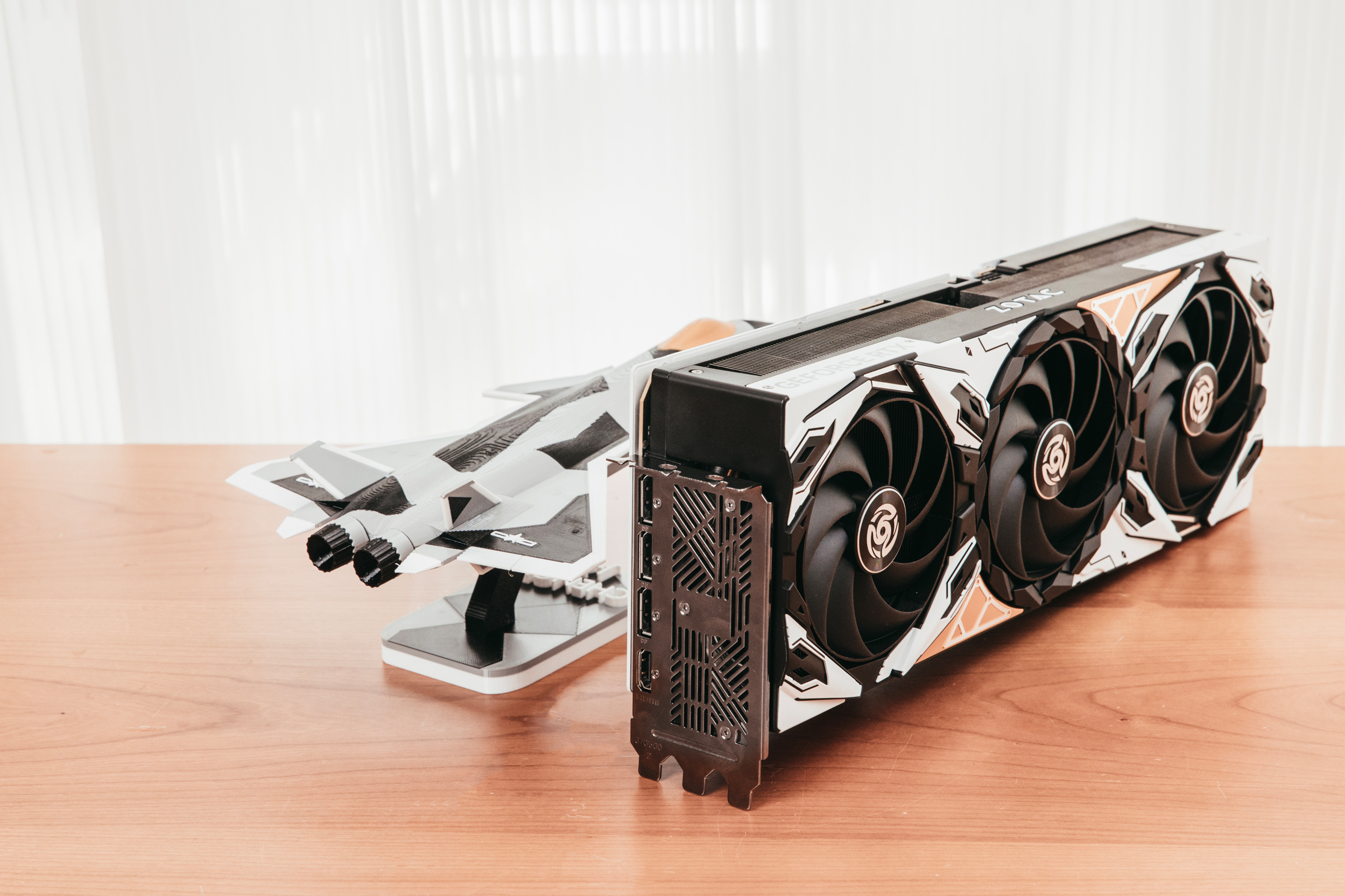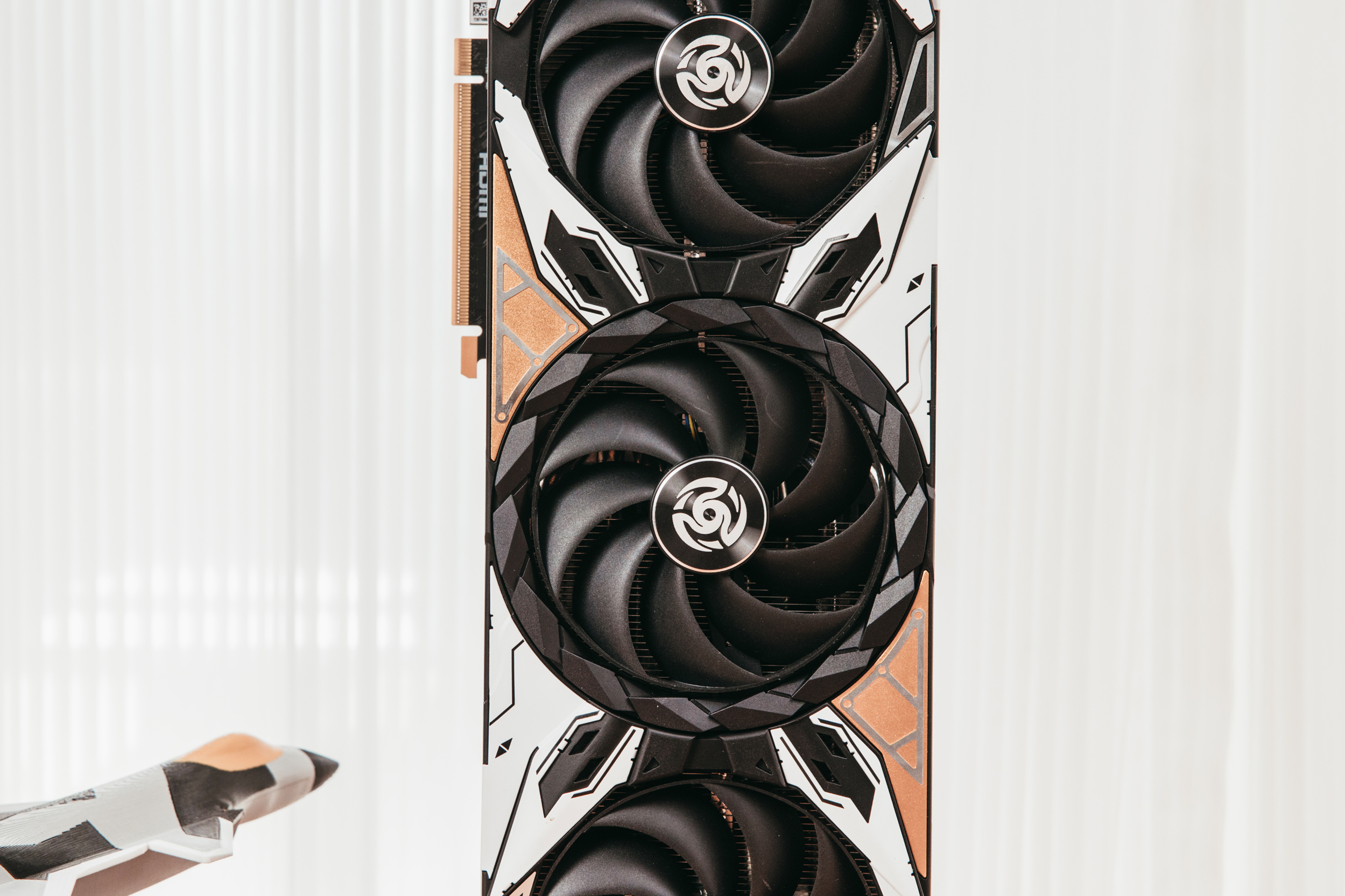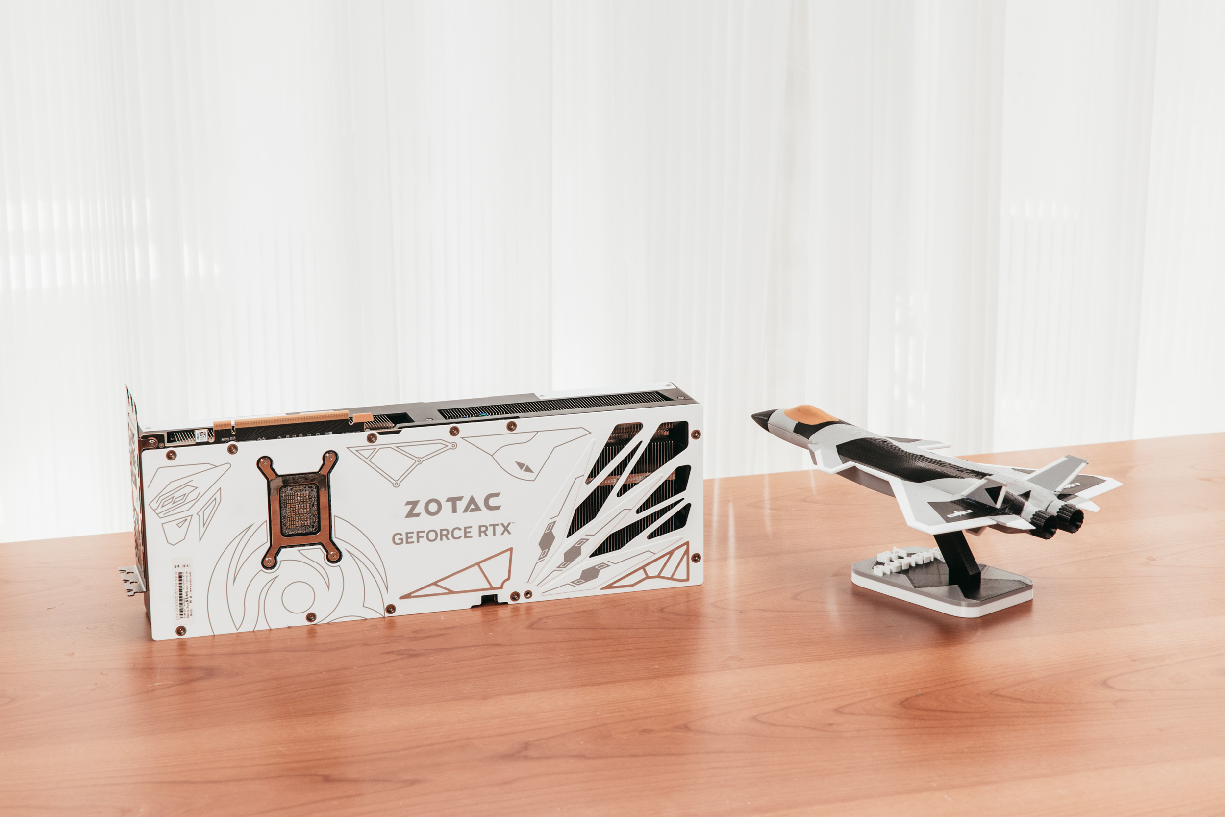显卡俯瞰视角,可以看到纯白背板的丰富元素。
