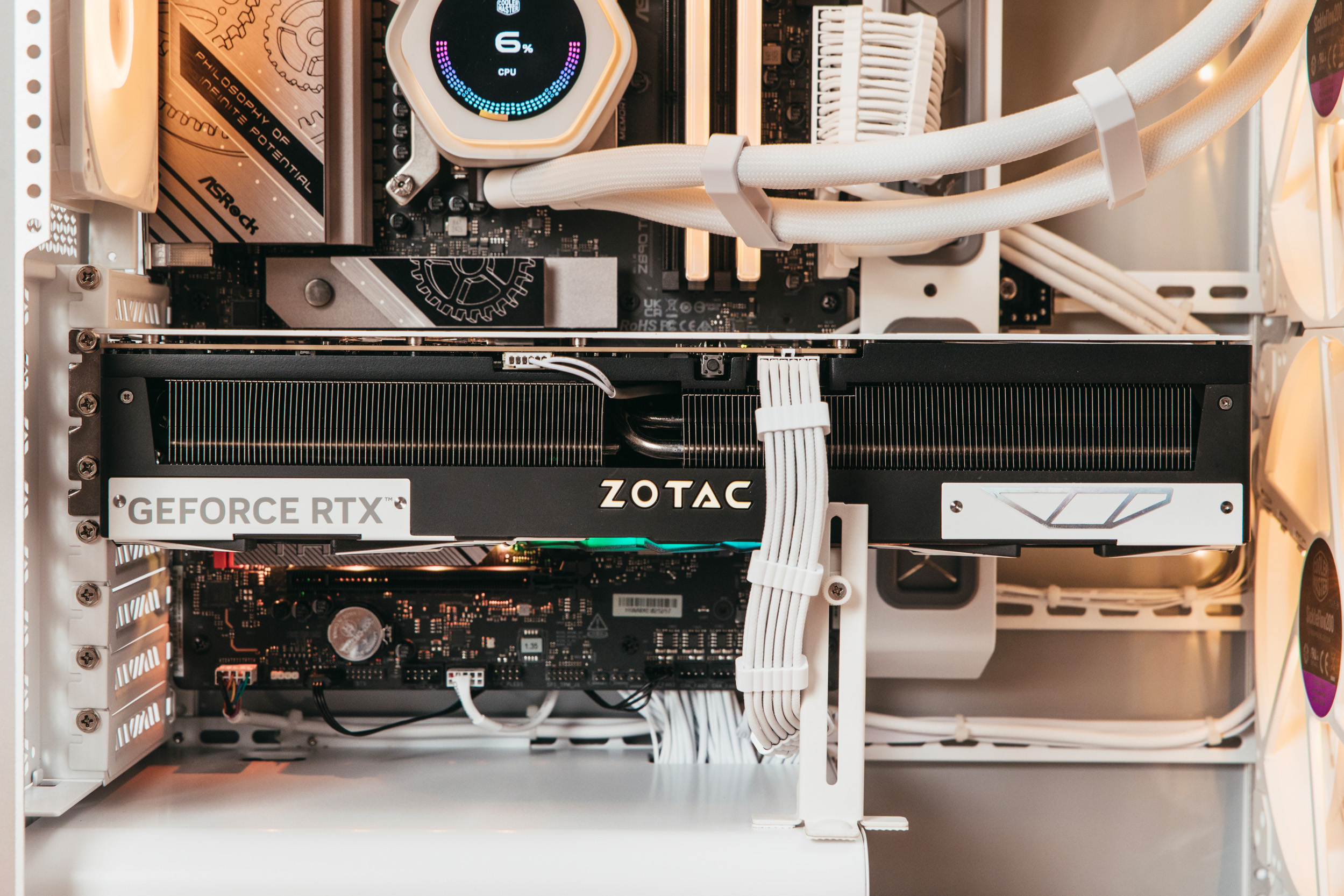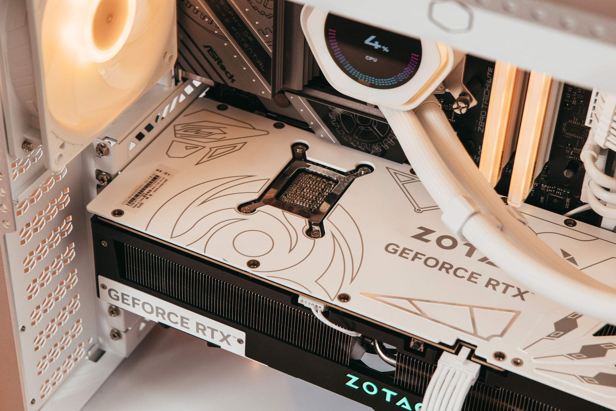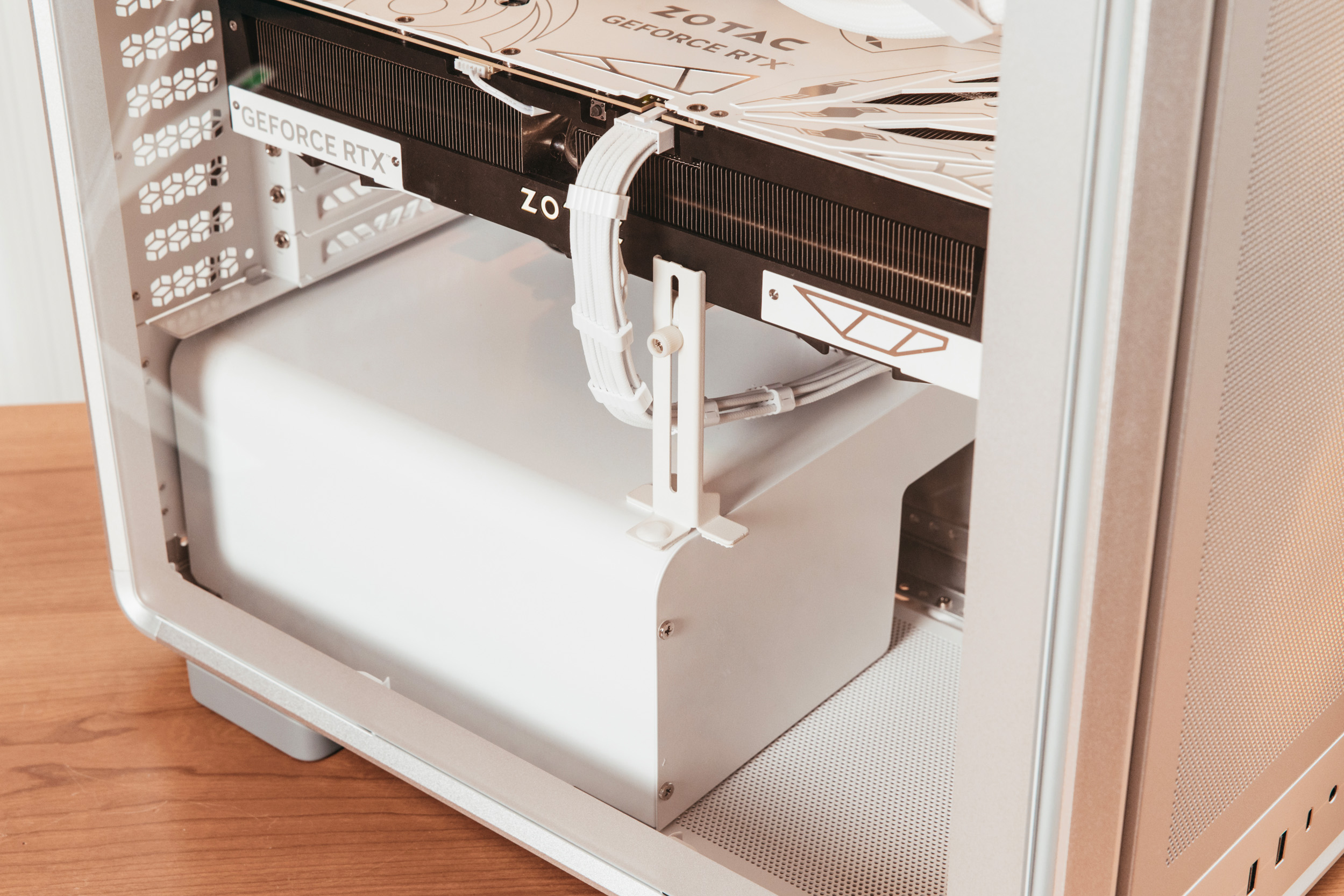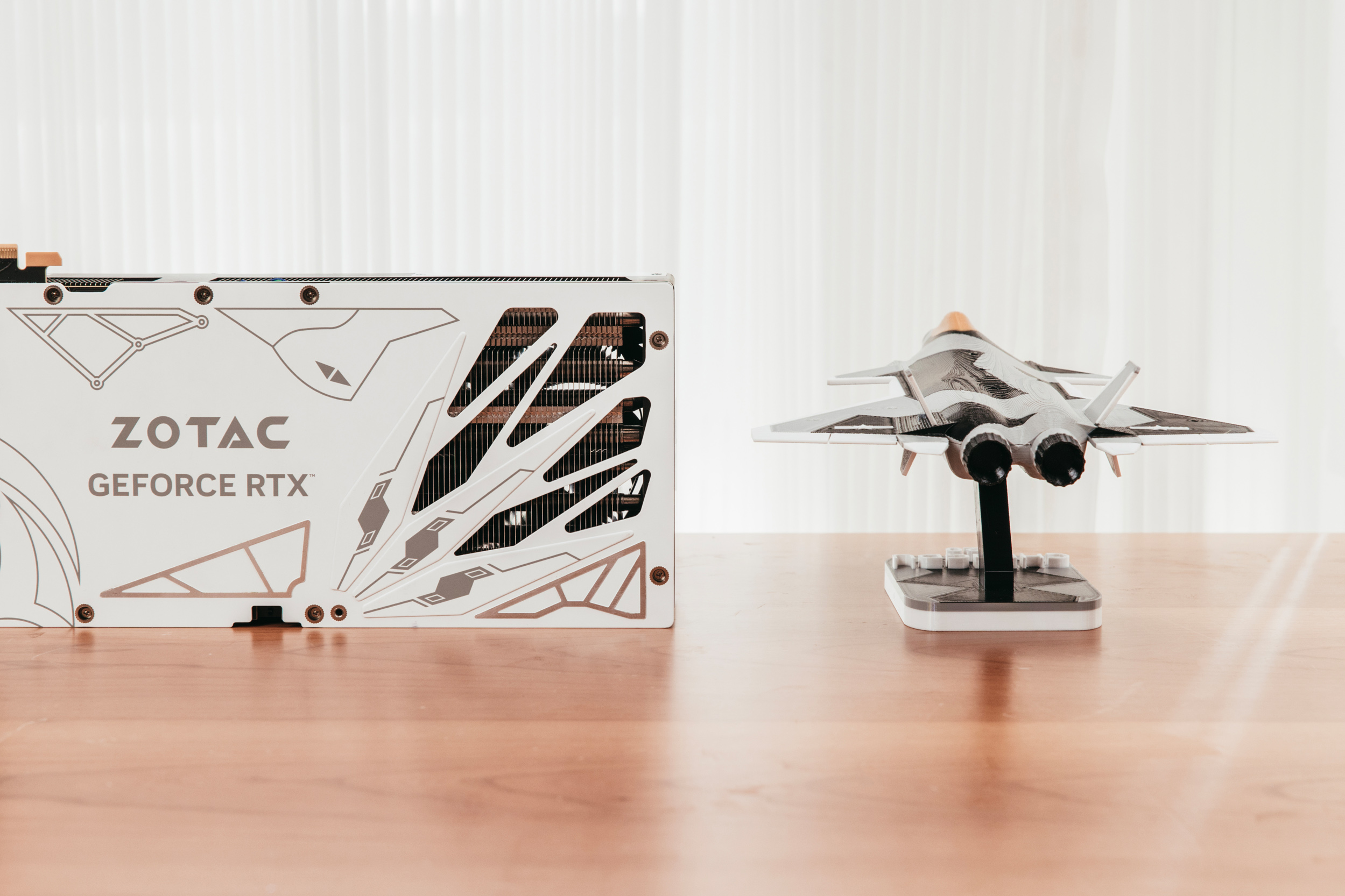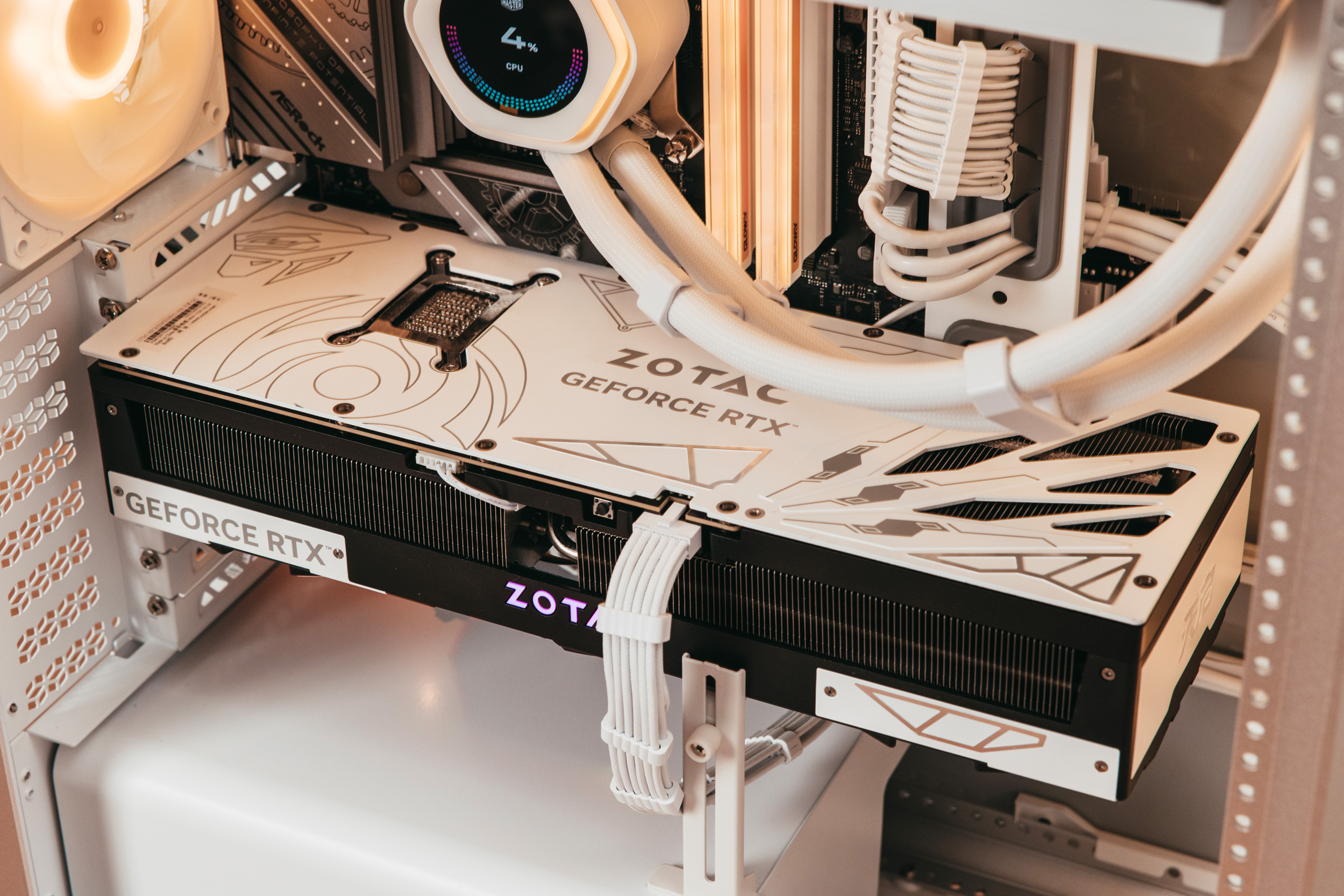 显卡俯瞰视角,可以看到纯白背板的丰富元素。