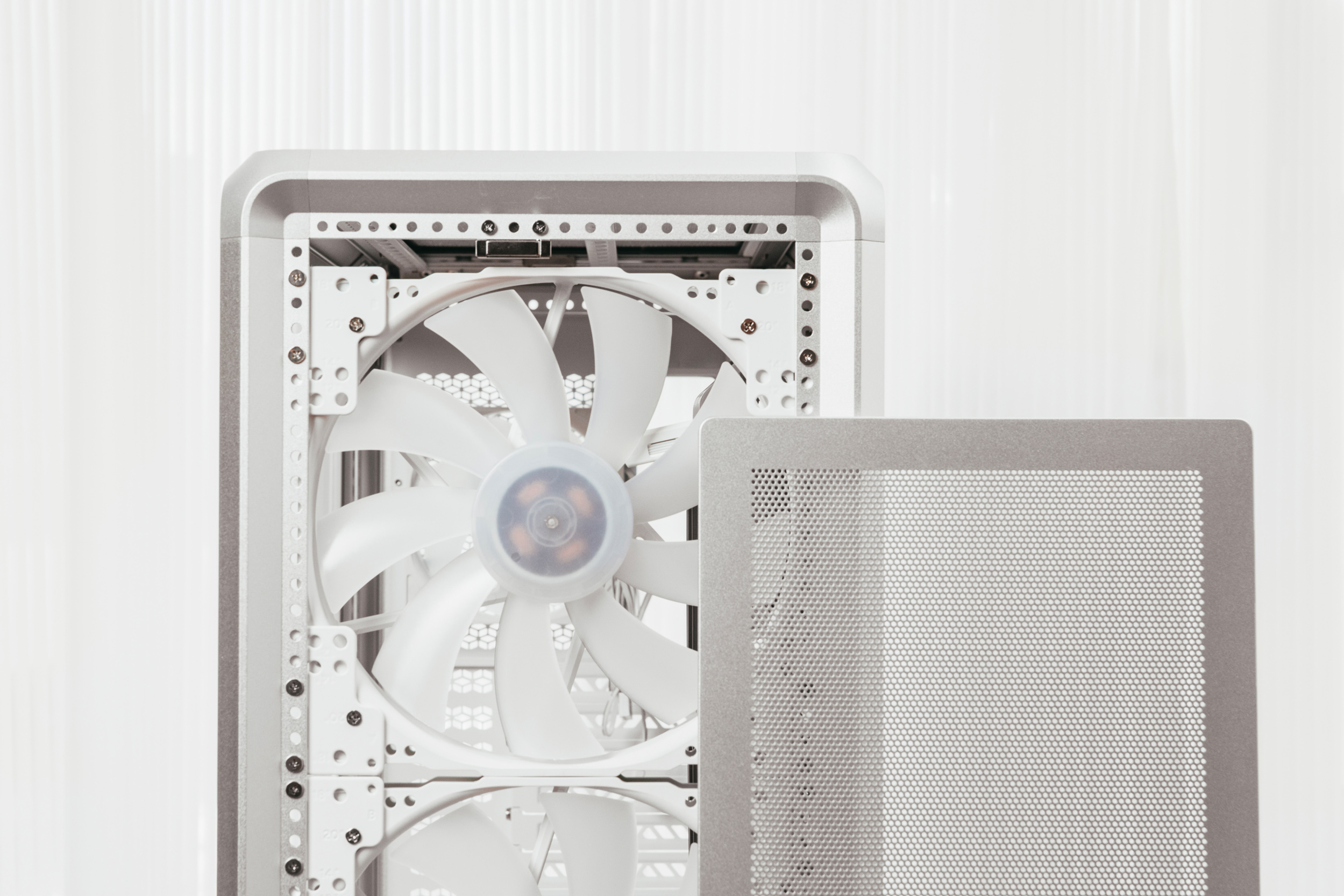 它的结构是传统的电源下置,前进气的结构,这个角度可以看到两颗硕大的20CM风扇,可以在超低转速下提供相当充沛的冷空气。