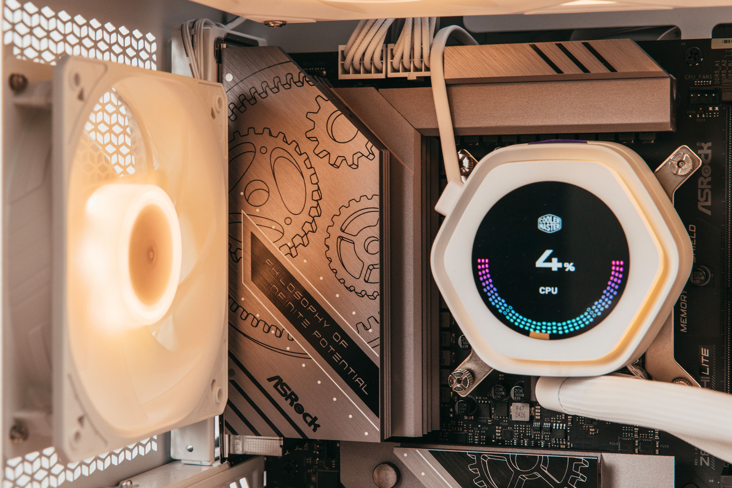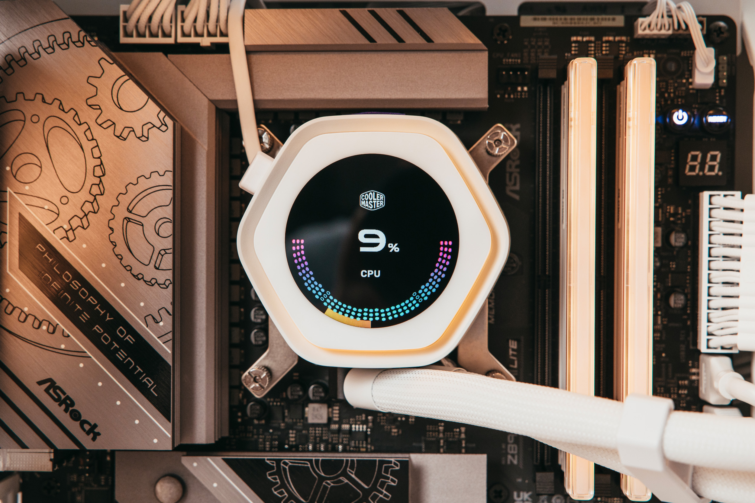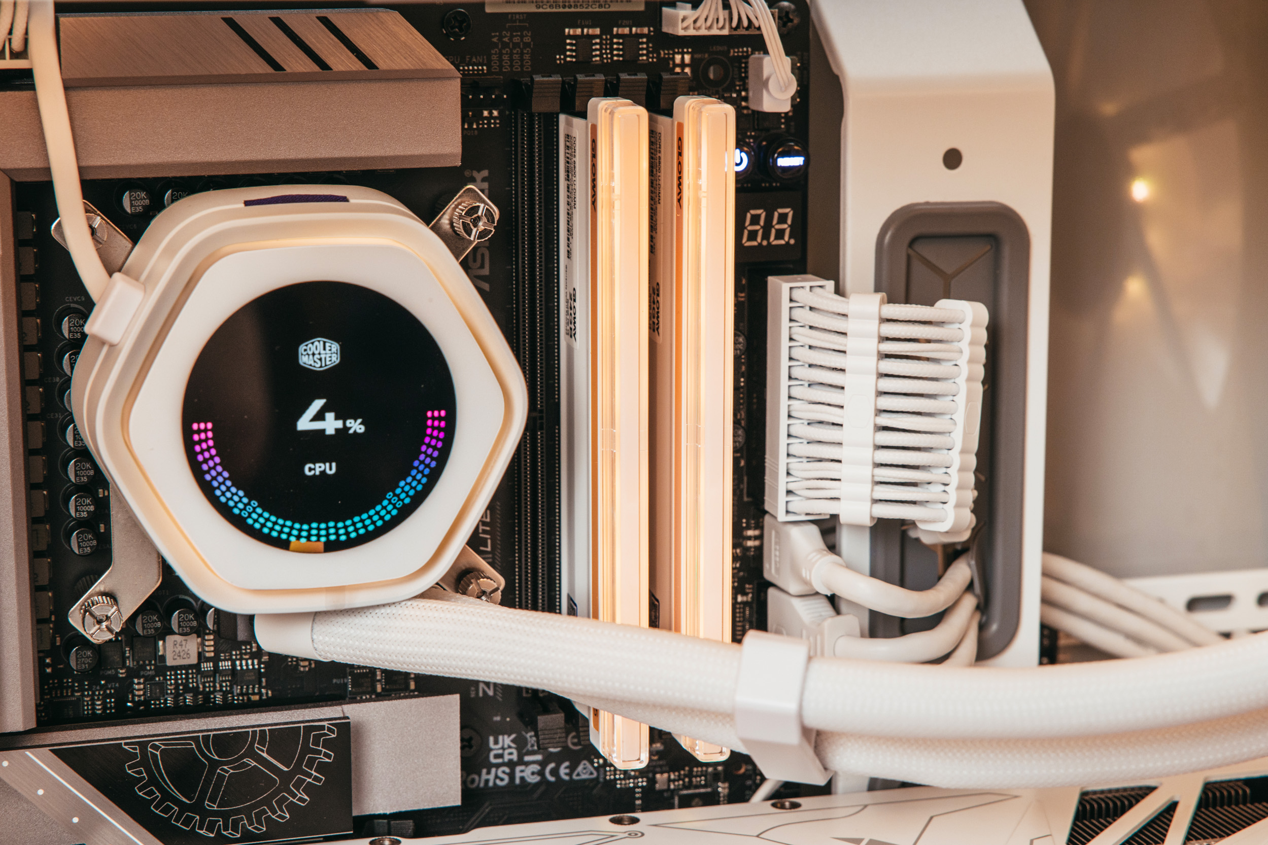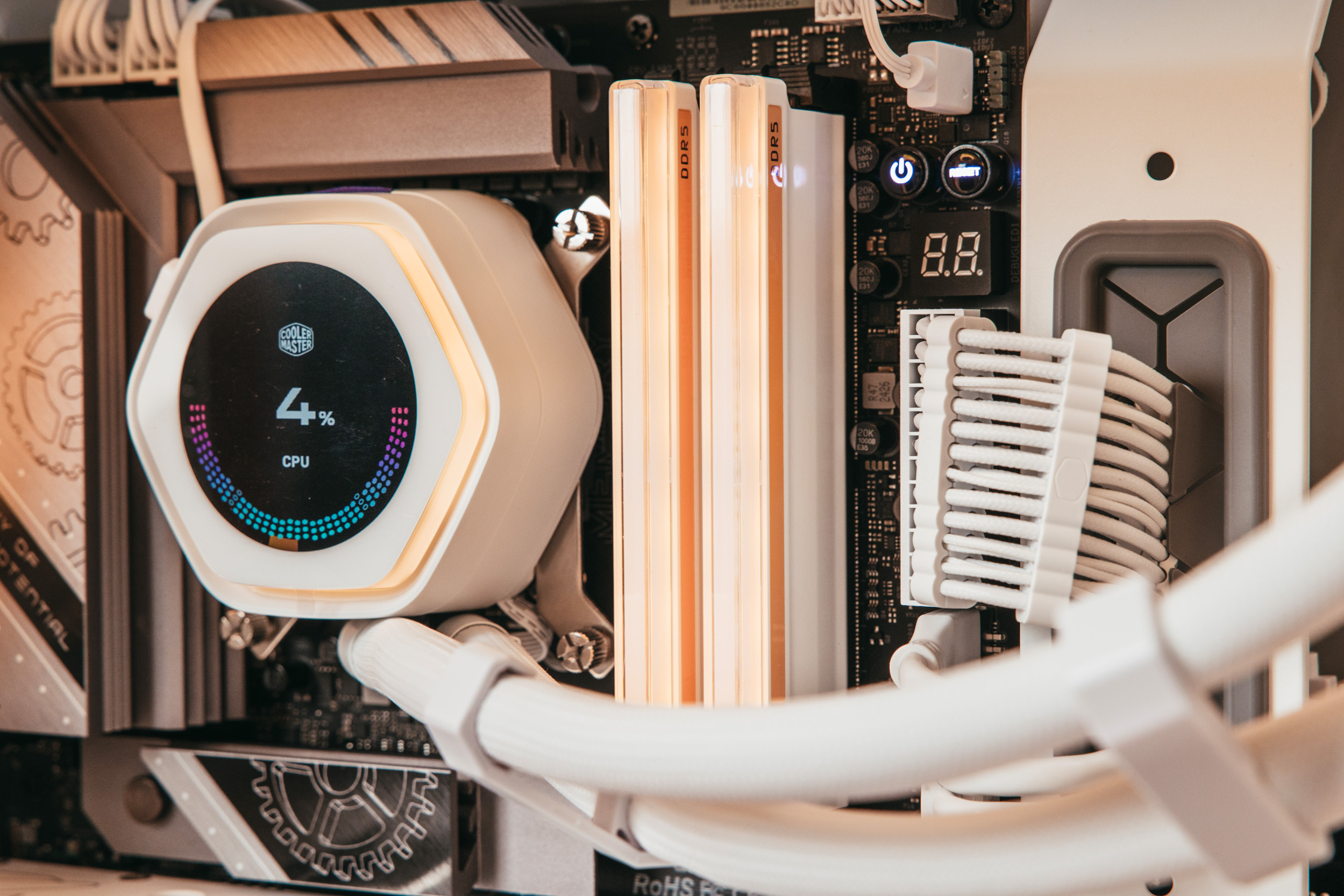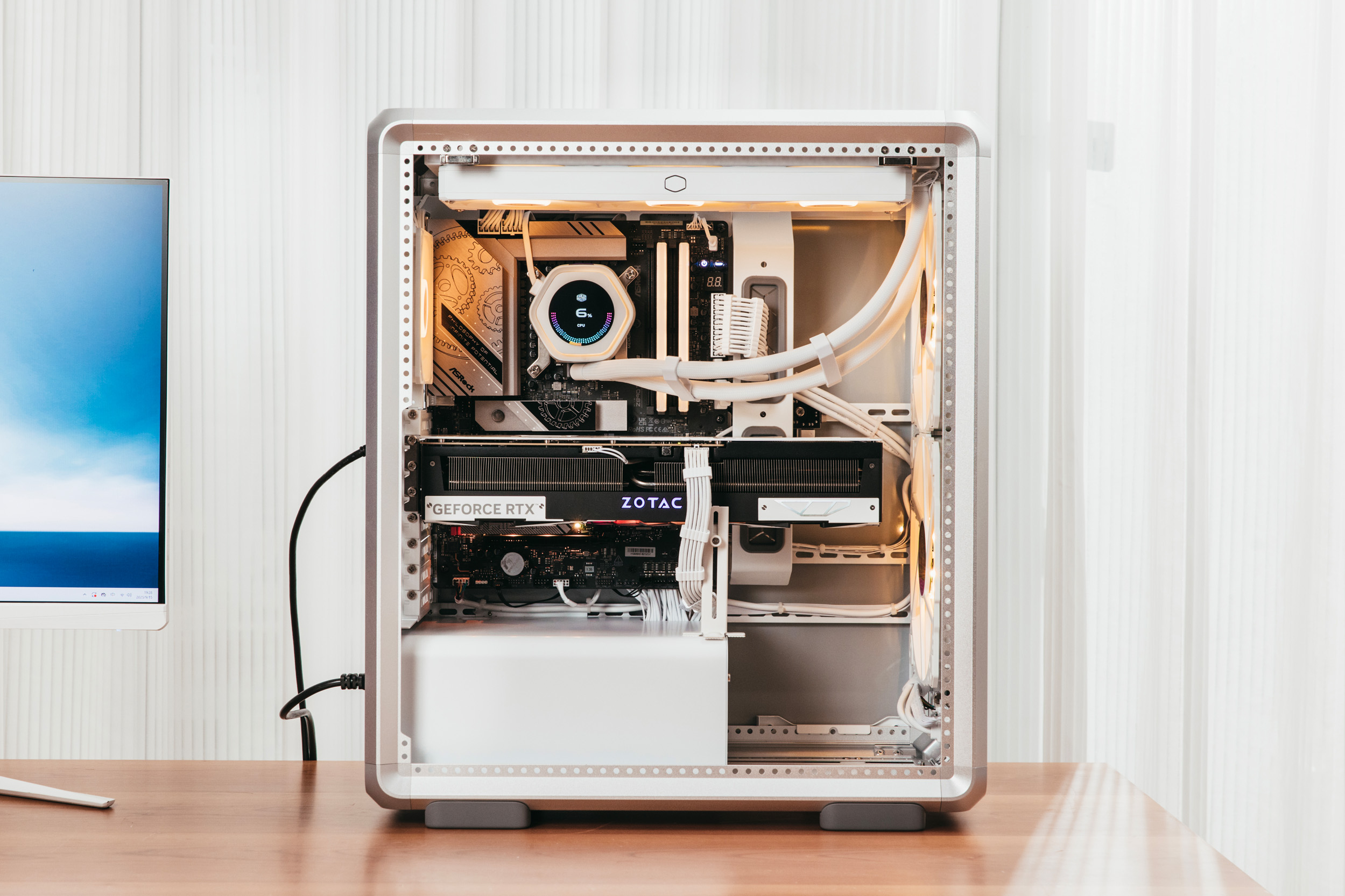 机电散来自酷冷至尊全家桶,水冷为龙影2代LCD版本,电源为GX PLIUS金牌全模组1000W白色,显卡索泰RTX 5070 Ti 16GB 天启 OC,内存为光威神策DDR5 6800 M die 24G X 2 ,主板是国内没发售的华擎Z890 Tachi lite,刚好手头有这么一张主板,就直接用了。
