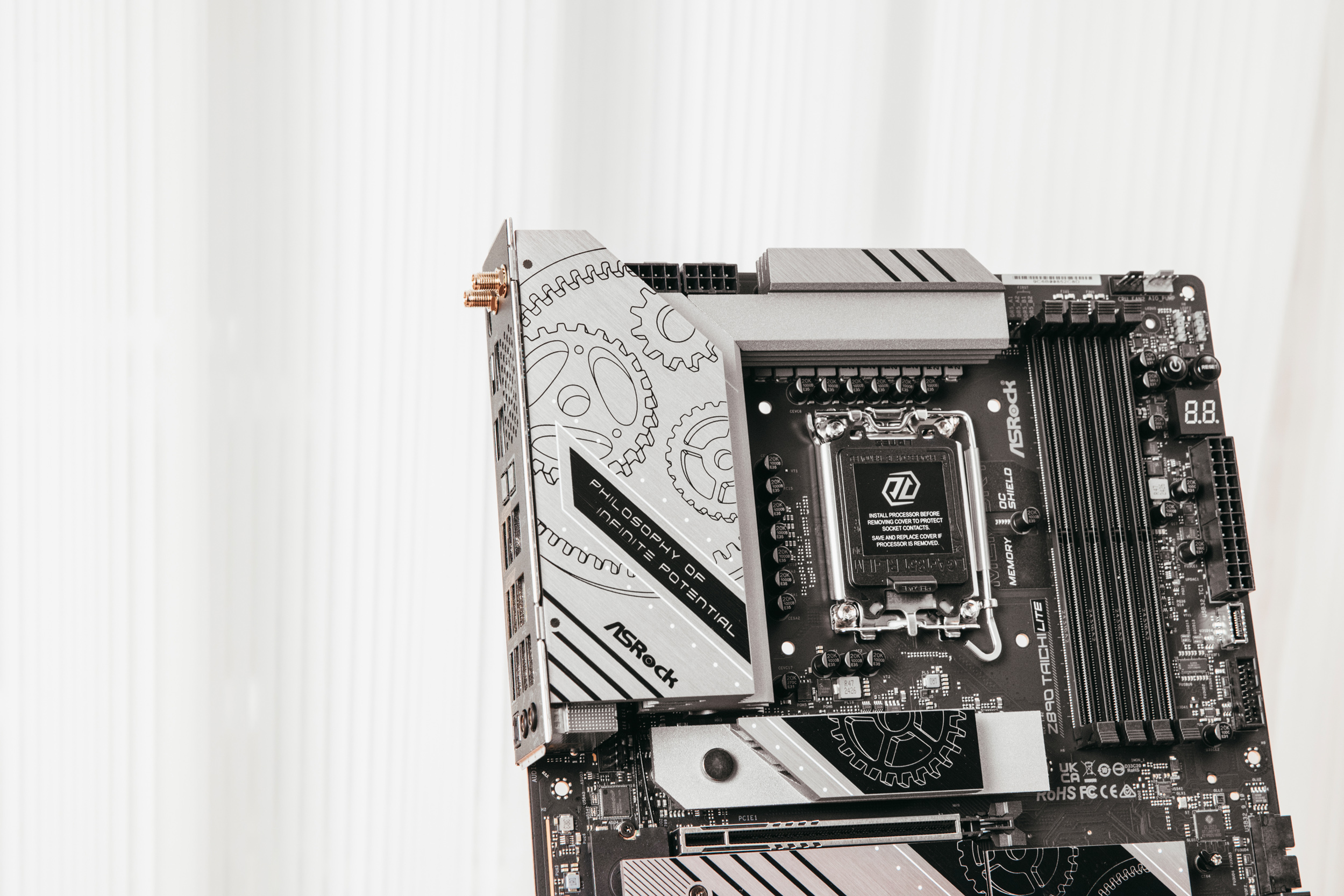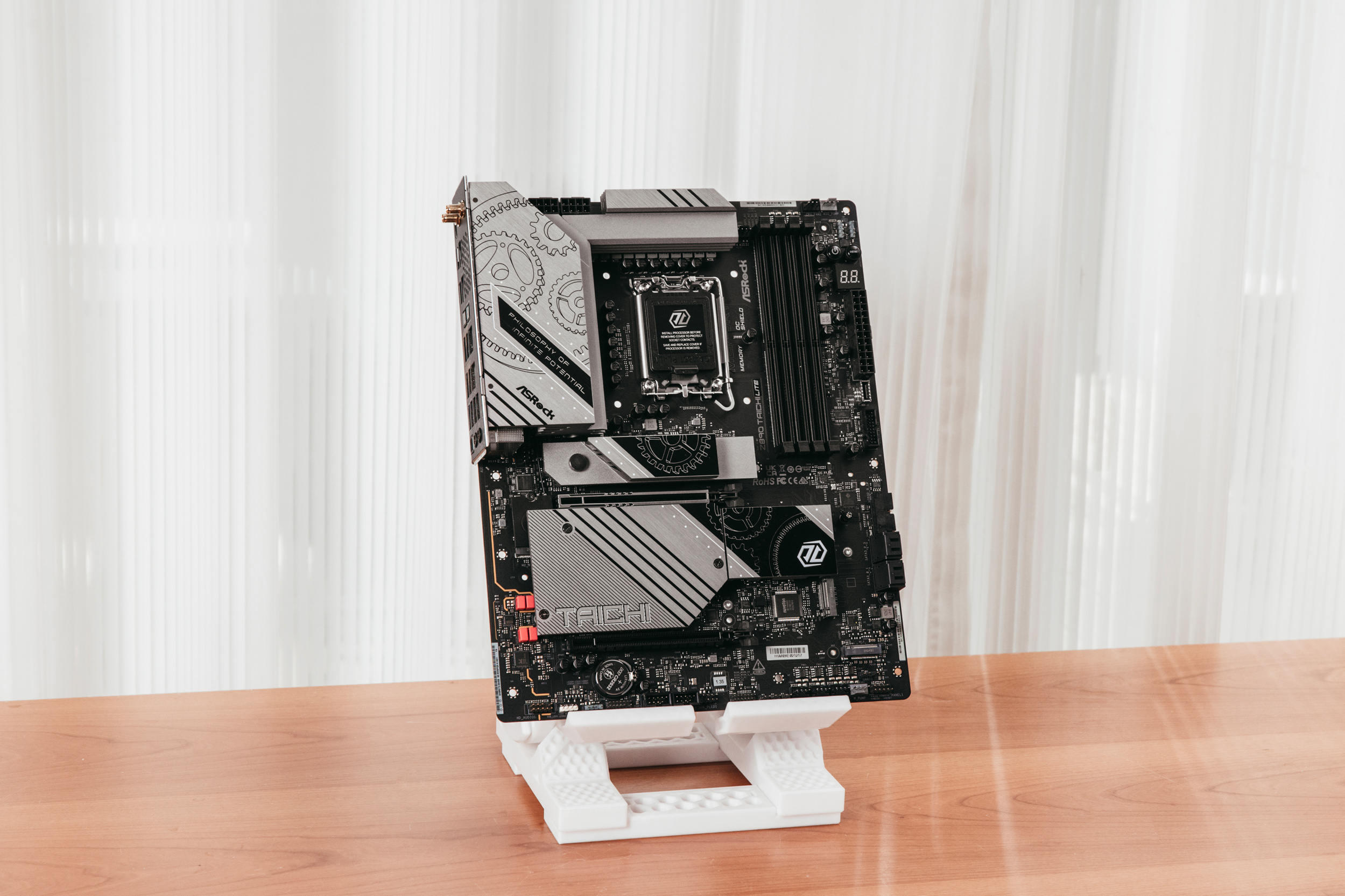 华擎这张主板设计元素非常丰富,在RGB灯光的映射下像是镀了一层金。