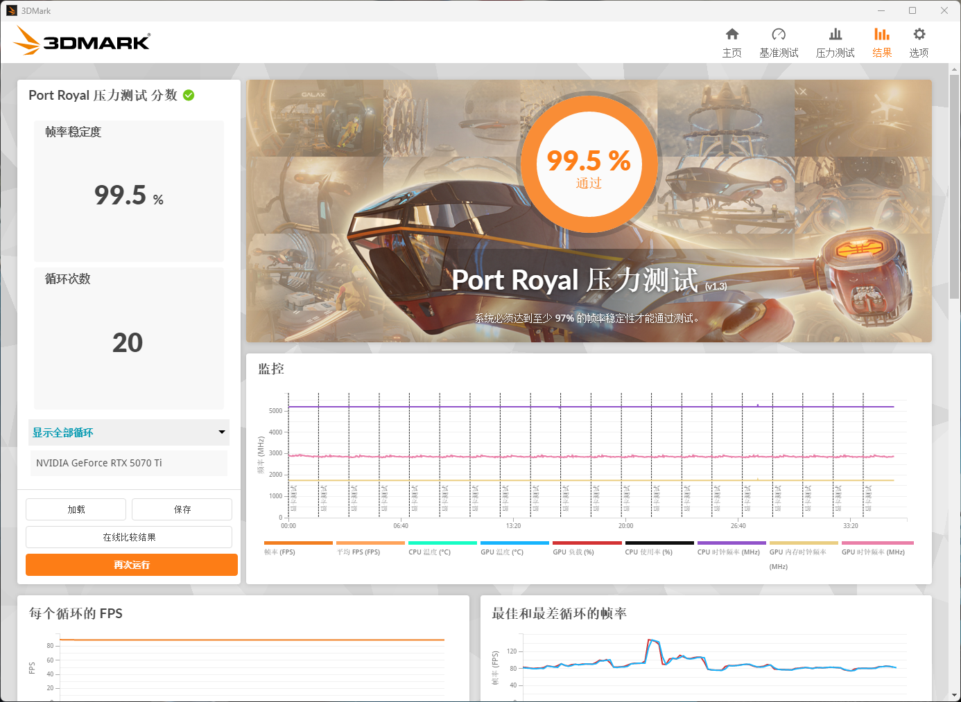 做了一个三连压力测试,Steel Nomad压力帧率测试稳定度99.1%、Speed Way压力测试帧率稳定度98.8%,Port Royal压力测试帧率稳定度99.5%。