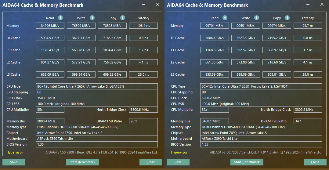 加载XMP设置,最高6800频率下读写速度为99/90G以及92G,延迟93.7ns,时序为CL34-46-46-108。