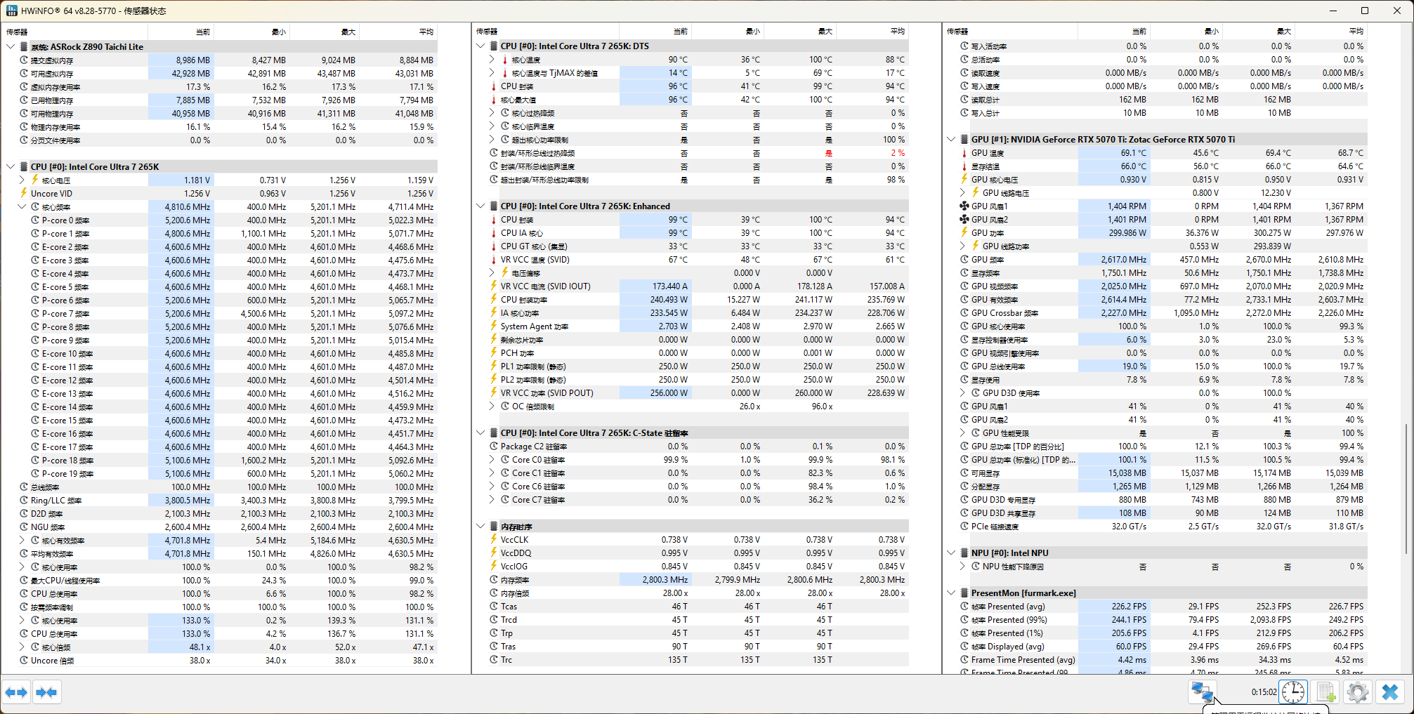 按照惯例跑双拷,这颗Ultra7 265K在功耗平均235W场景下,酷冷至尊龙影2代基础版360水冷成功将核心温度压到了平均88度,P核E核核心频率最大分别为5.2Ghz和4.6Ghz。