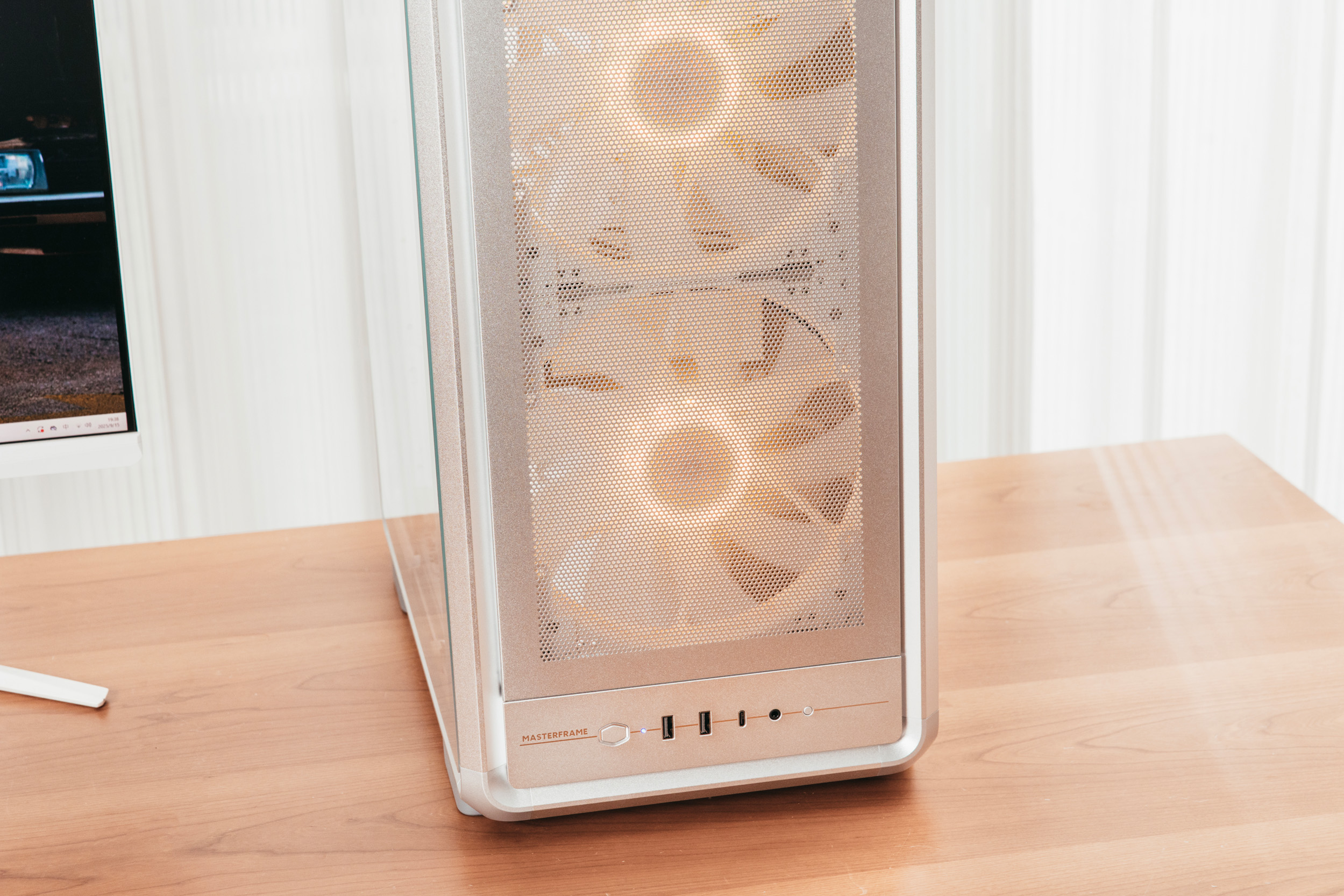 MF500 MESH的还是有很多亮点的,比如磨砂玻璃和金属材质的侧板,可以自由调整的铝合金结构的框架,以及酷冷家族200MM的大尺寸低转速高气流进气风扇。