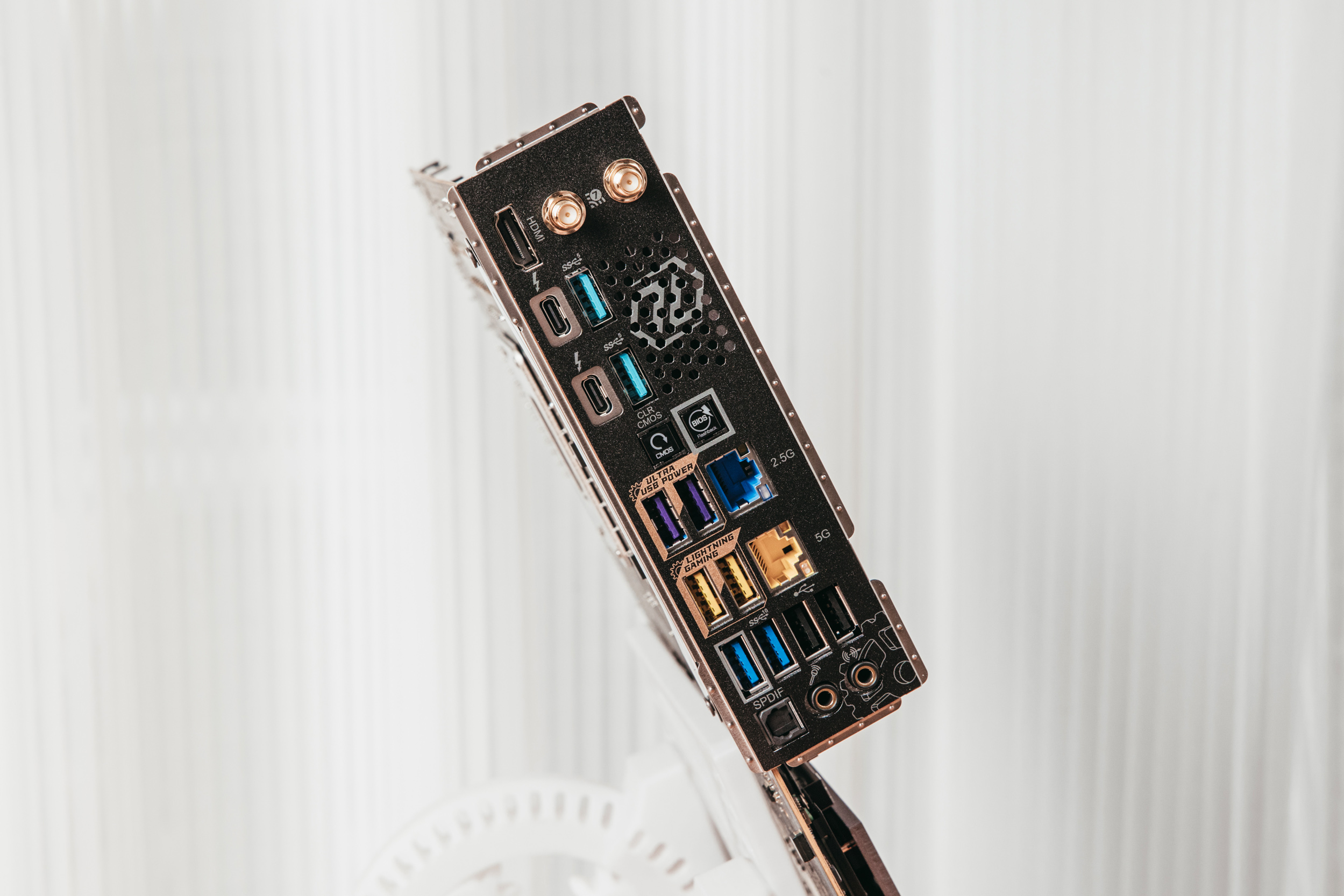它的接口很有意思,可以看到双网口的设计,2.5G和5G有线传输速率,非常适合局域网访问NAS,当然还有双雷电四和WiFi7。