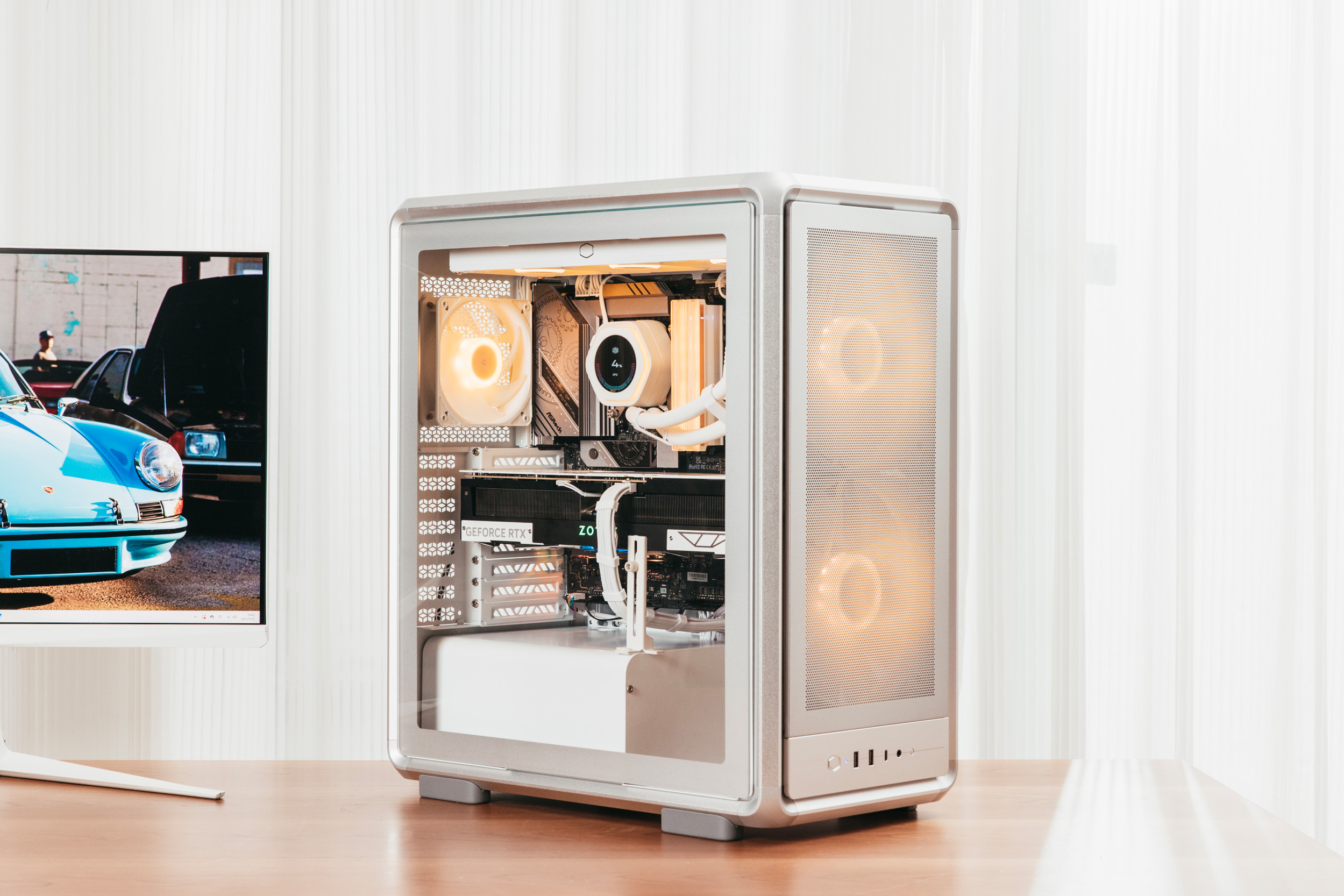 侧方位视角,能看到机箱八个角做了圆润处理,右侧金属玻璃侧板质感也有别于常规金属侧板。