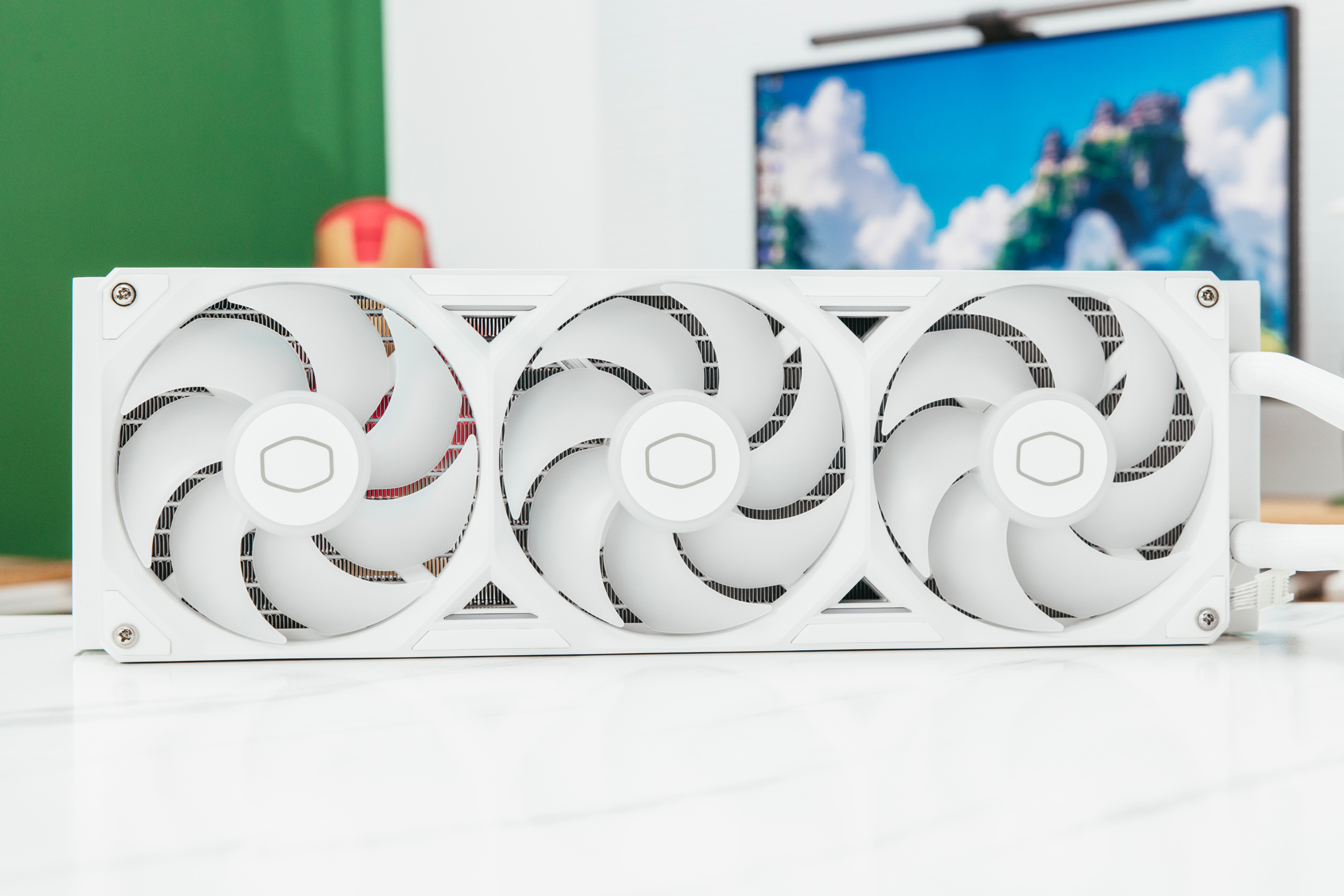 三个风扇均带有环形导流风罩,支持智能启停,风扇尺寸10CM,9片扇叶,扇叶曲率做了优化,可以提升风冷和风压,增强散热效果,也有着不错的噪音表现。