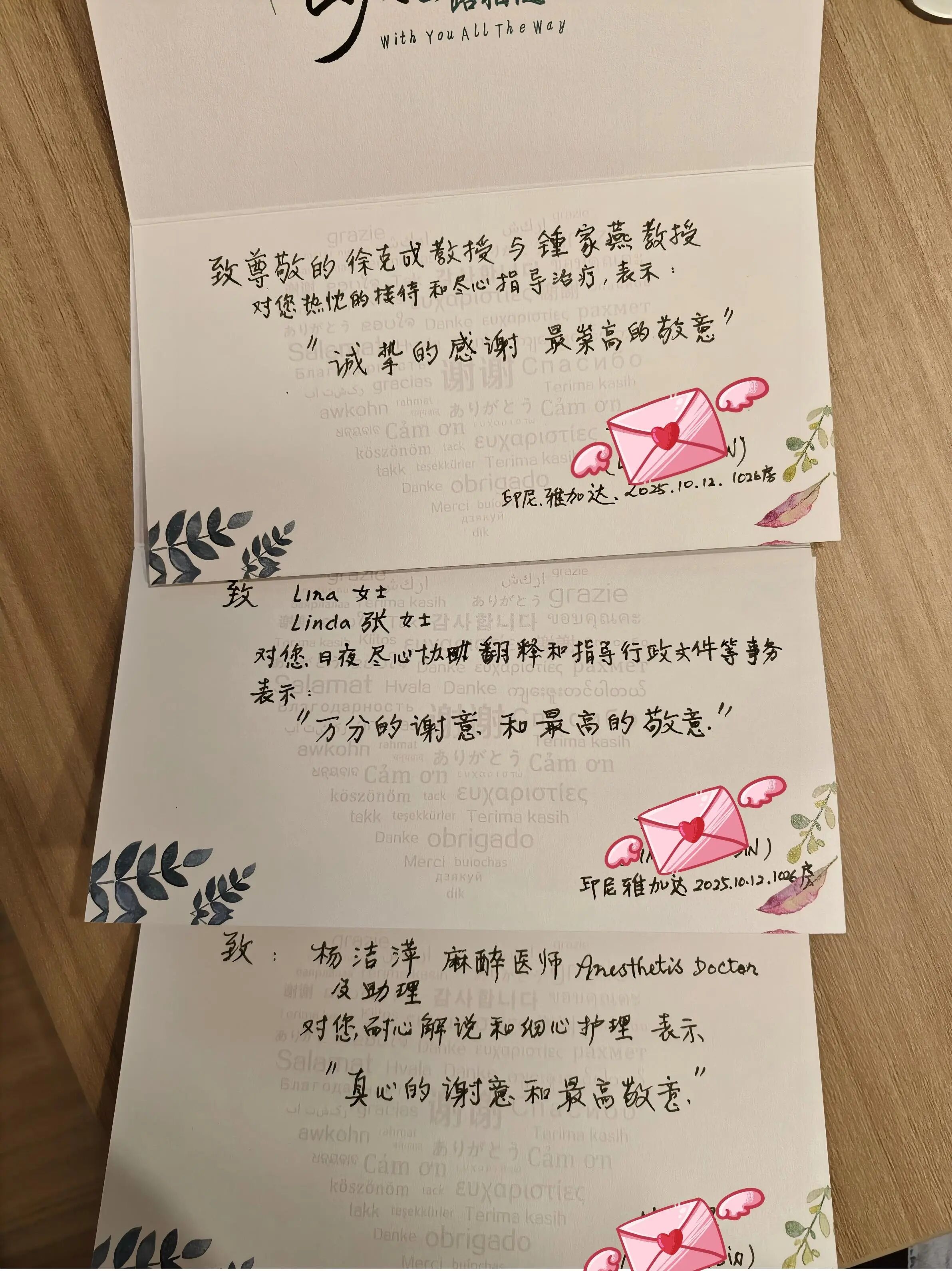 近日,皇家丽收到了一位74岁印尼肺癌患者亲手写下的五封感谢信。字里行间,满是一位长者跨越山海、在皇家丽获得医治与关怀后的诚挚谢意。