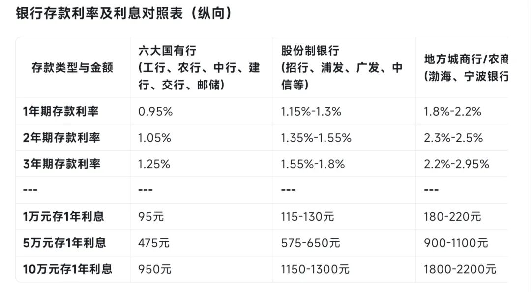 国有六大行一年期在0.95%~0.98%,进入“0字头”时代。而定期二年至五年的,大多基本都是1.05~1.60%。