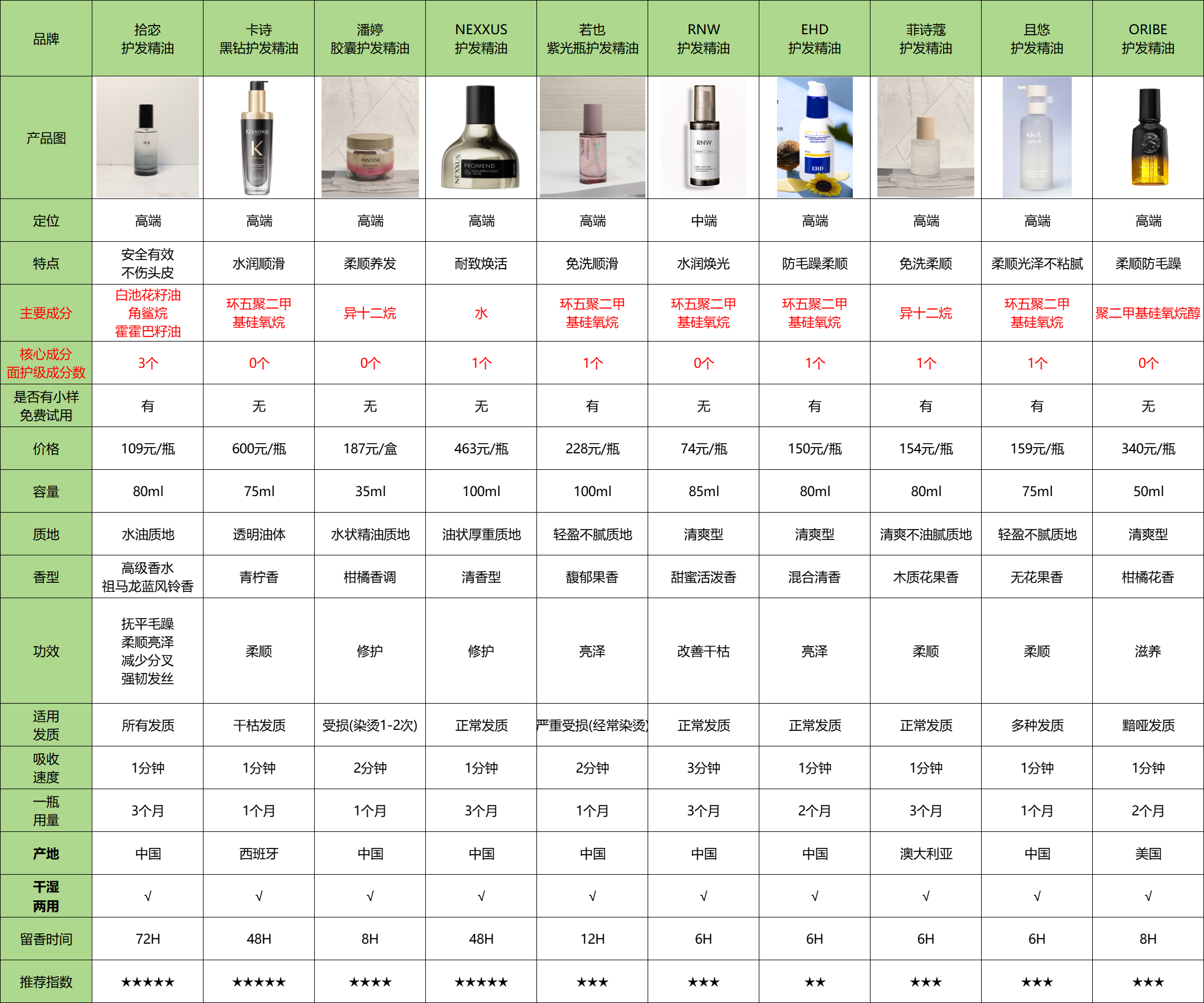选护发精油前,我真的建议先把基础数据捋一遍,不然很容易被外包装和香味迷惑,最后买回去才发现不合适。表格这种东西虽然看着枯燥,但关键指标一目了然,能省下不少冤枉钱。下面我把这次测评里几款护发精油的核心数据放在一起了,成分、质地、吸收这些都能直接对比,看看哪款更贴近自己日常的需求。
