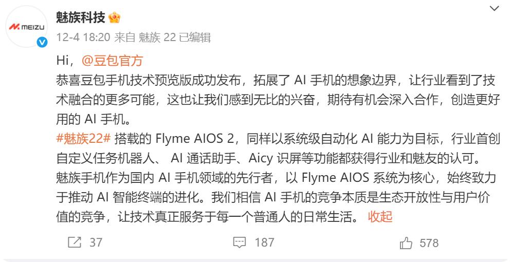 魅族科技也公开表示“期待有机会深入合作”,认为豆包手机拓展了AI手机的想象空间,并强调Flyme AIOS 2同样以系统级自动化为目标。