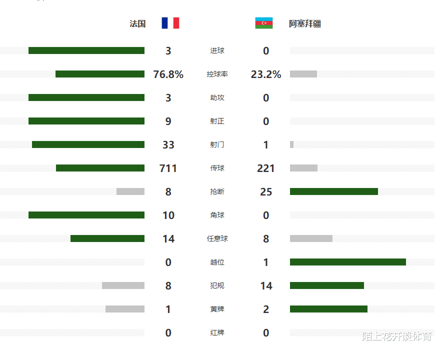 第69分钟法国队卷土重来,右侧角球开出后,阿塞拜疆球员抢到了第一点,但皮球落到了左侧的姆巴佩脚下,皇马锋霸挑传门前,拉比奥特头球建功,帮助高卢雄鸡将领先的优势扩大到了2球,姆巴佩也完成了传射建功的好戏,比赛最后时刻,替补登场的托万锦上添花,将全场比分定格为了3-0。