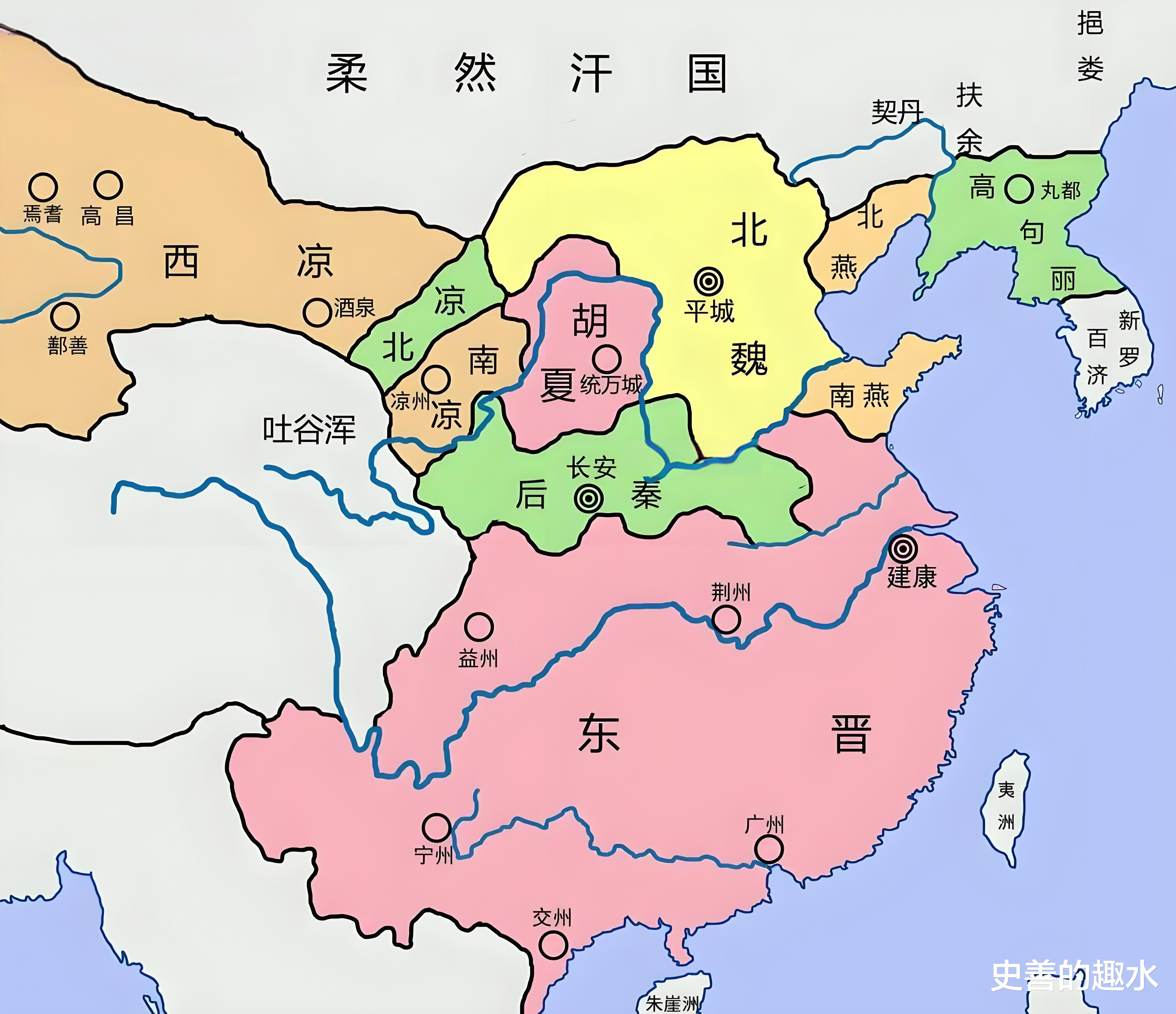 具体来说,关东地区有三个国家:北魏、后燕(次月即被北魏灭亡,北燕随之建立)、南燕;关西则由后秦与胡夏对峙;河西走廊一带则分布着南凉、北凉和西凉三个割据政权。
