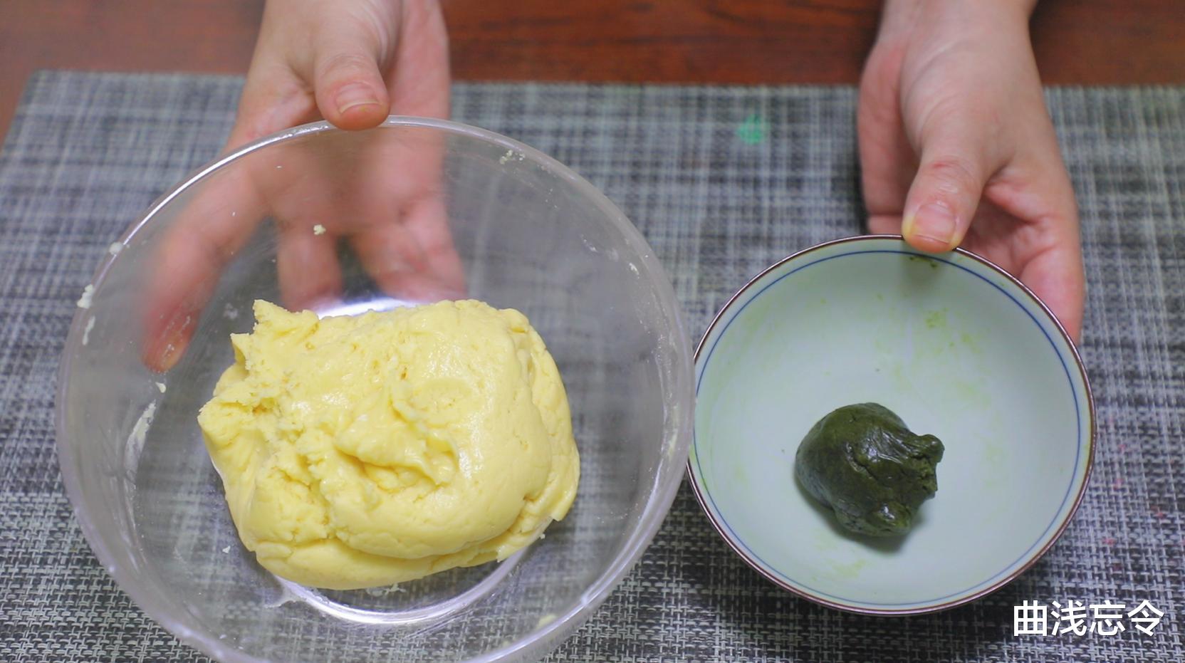 4.关于绿叶部分不好脱模的问题,推荐先在模具里面刷一层干粉防粘。另外,绿色与原味接触位置刷点水,可以使其两种面团更好粘合在一起。