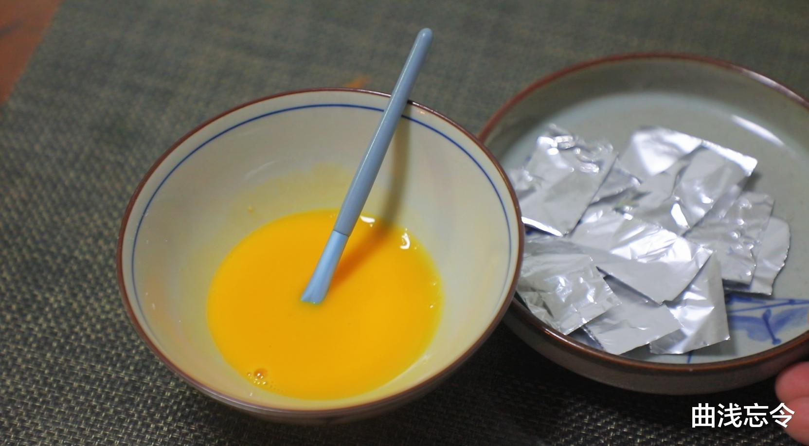 10、一个蛋黄加少许水调成蛋黄水,锡纸剪一些小长方形备用。等凤梨酥出炉稍微晾至温热,在凤梨酥原味部分的表面和侧面都刷上蛋黄水,叶子部分盖上锡纸防止烤上色会偏黄不好看。盖锡纸下可刷一点点水防止风炉模式时吹掉锡纸。