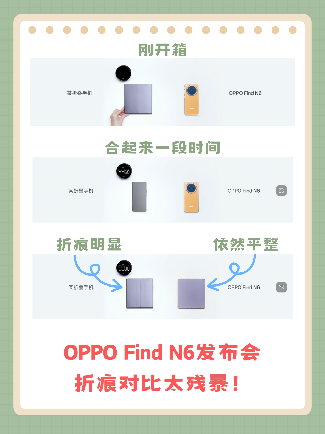 OPPO Find N6发布会这折痕对比简直是贴脸开大啊,真的太明显了,隔壁手机新开箱的时候虽然平整,但是只要合起来一段时间,折痕就很明显了。而OPPO Find N6合起来的时间还更长,但是却平整得像平板一样。