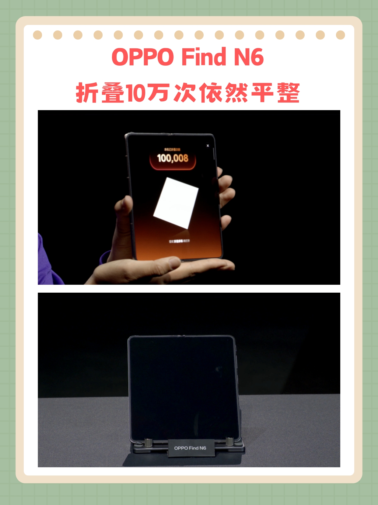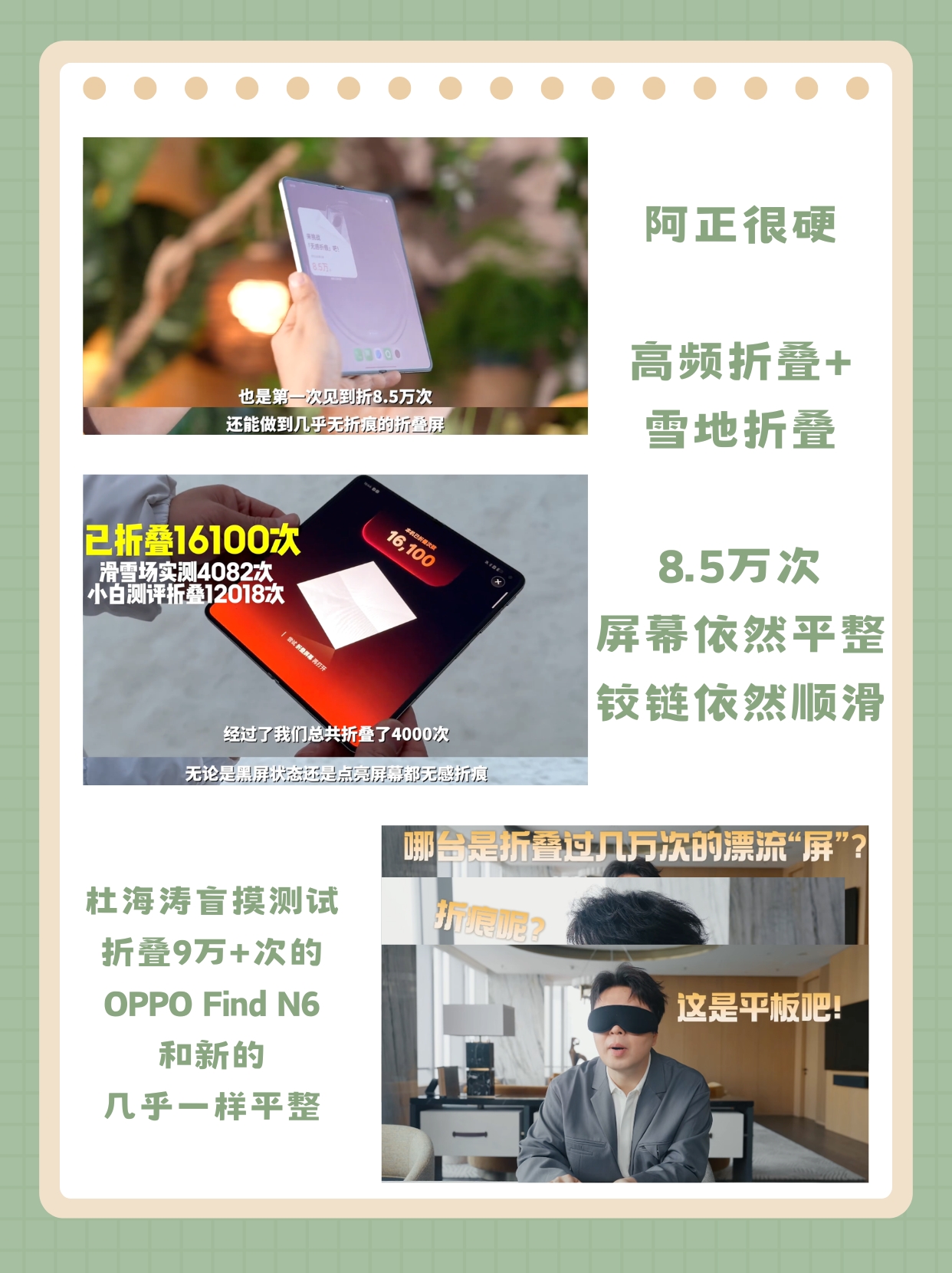 还有那个“漂流‘屏’计划”也是挺秀的,把一台独一无二有签名的OPPO Find N6传到各大博主和明星手里轮番“蹂躏”,共计折叠了整整10万次!最狠的当属直接上了高频折叠+雪地极寒折叠的极限测试,造了8.5万次!结果N6的屏幕依然平整如初,铰链开合也一样丝滑。后来传到杜海涛手里做盲摸测试,这台折了9万+次的老机子,盲摸起来竟然和全新的几乎零差别,这平整度和耐用度让人大写的服气!