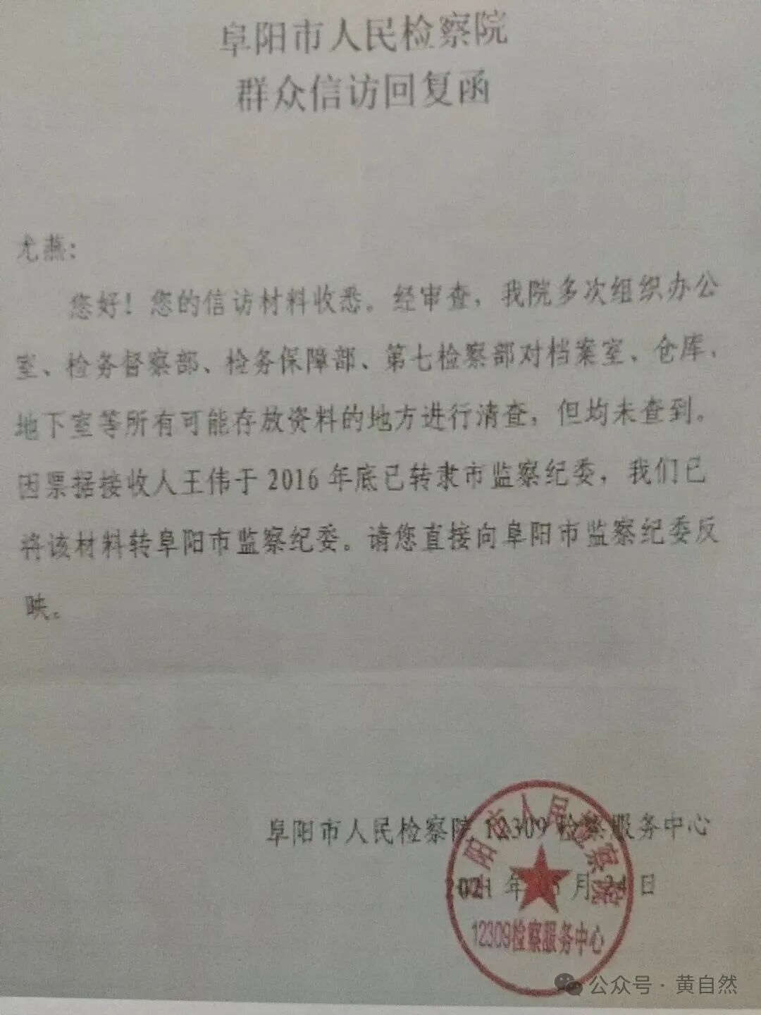 5、阜阳市人民检察院《群众信访回复函》复印件。