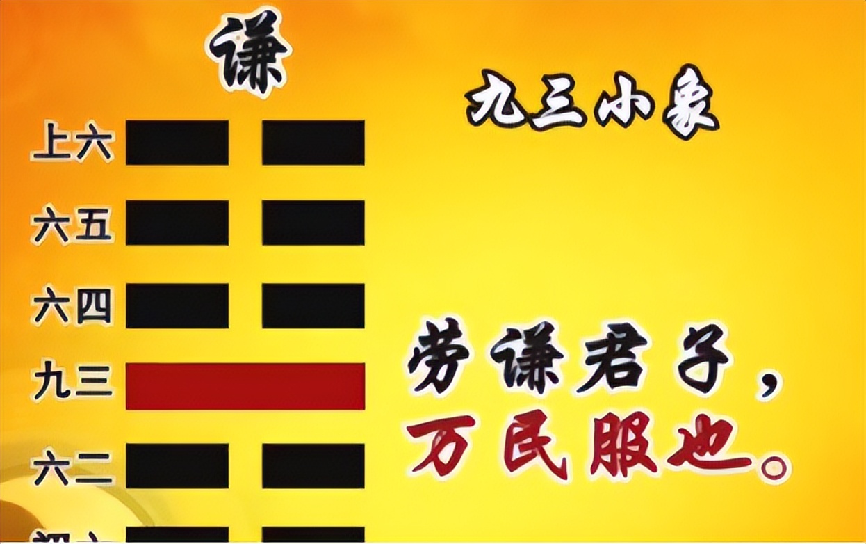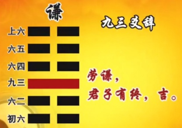 一个人有能力,然后现在表现的又受到赏识就进入九三爻,九三爻是这整个谦卦的卦主,因为其他的都是阴爻,只有九三爻是阳爻,而且它是一个山的顶点,最硬的地方。