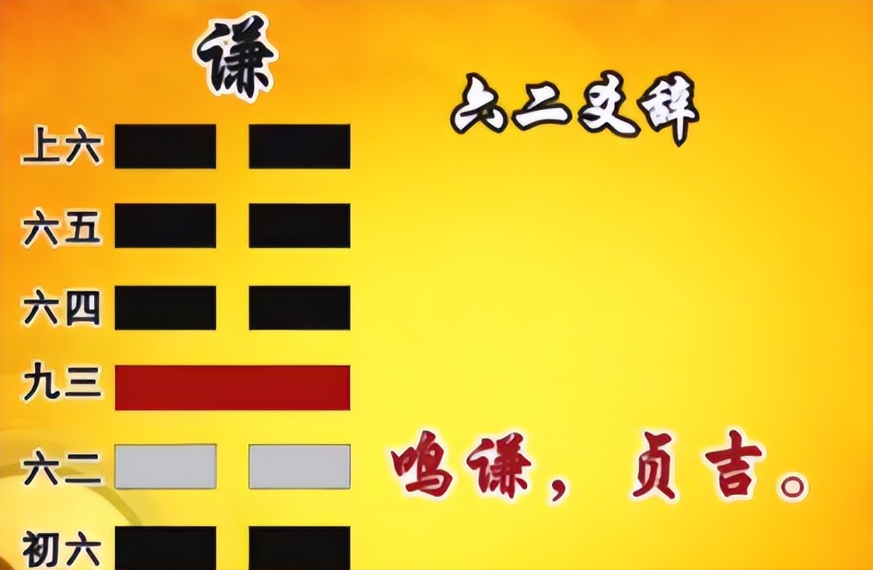 六二正好在这个雷鸣的底下,所以用一个“鸣谦”,意思就是得到上面人对你的称赞,从初六爻来到了六二爻,你各方面表现的更好。