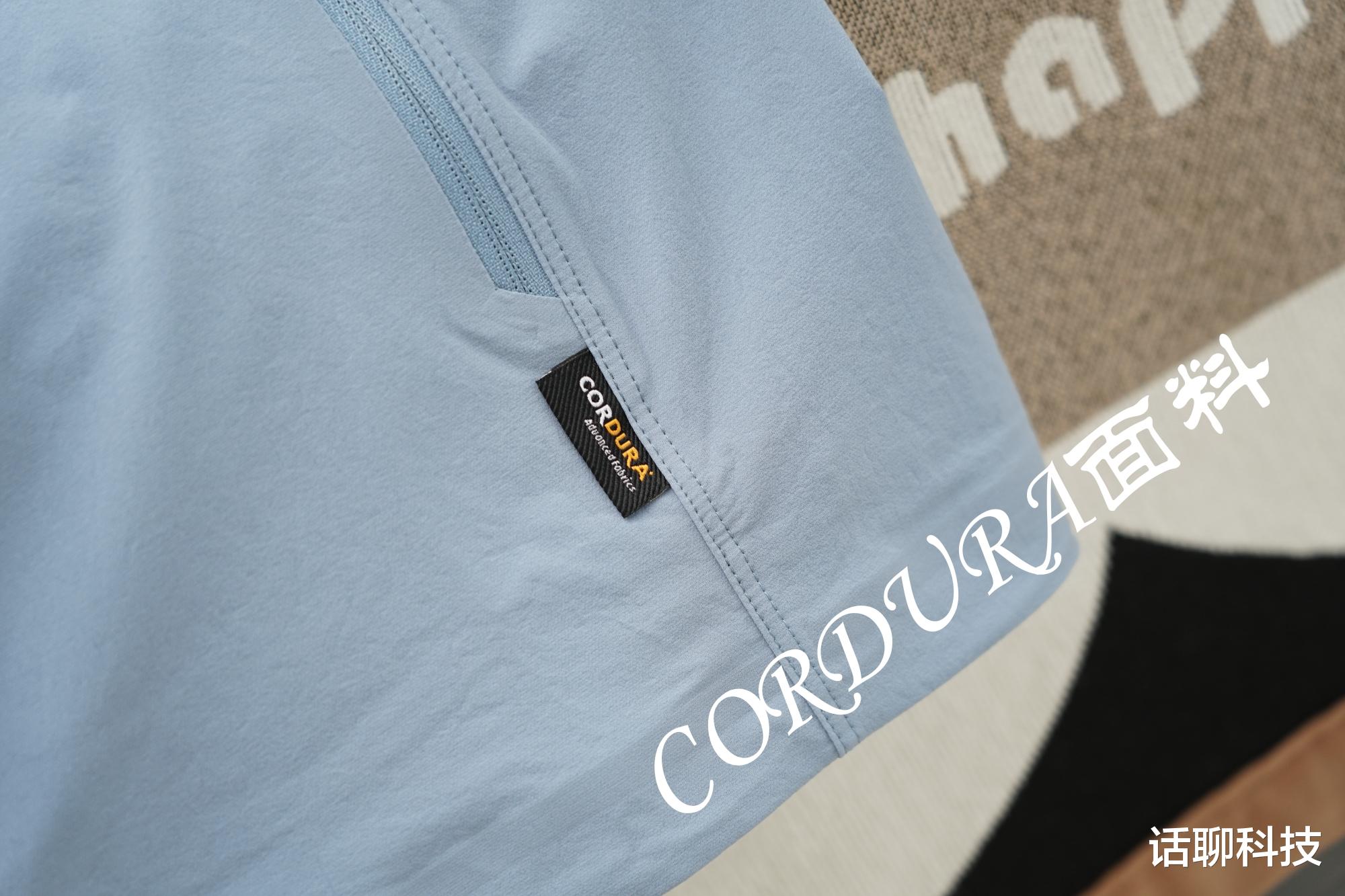 其面料采用了CORDURA考杜拉高性能面料,40D+20D+70D的高强度纱线单层双织,具有轻薄、透气、微弹、防泼水、耐磨耐刮的特点,实验室参数:面料每平米克重113g、防刮耐磨 >30000次、表面抗湿性能4-5级、透气性能38mm/s。