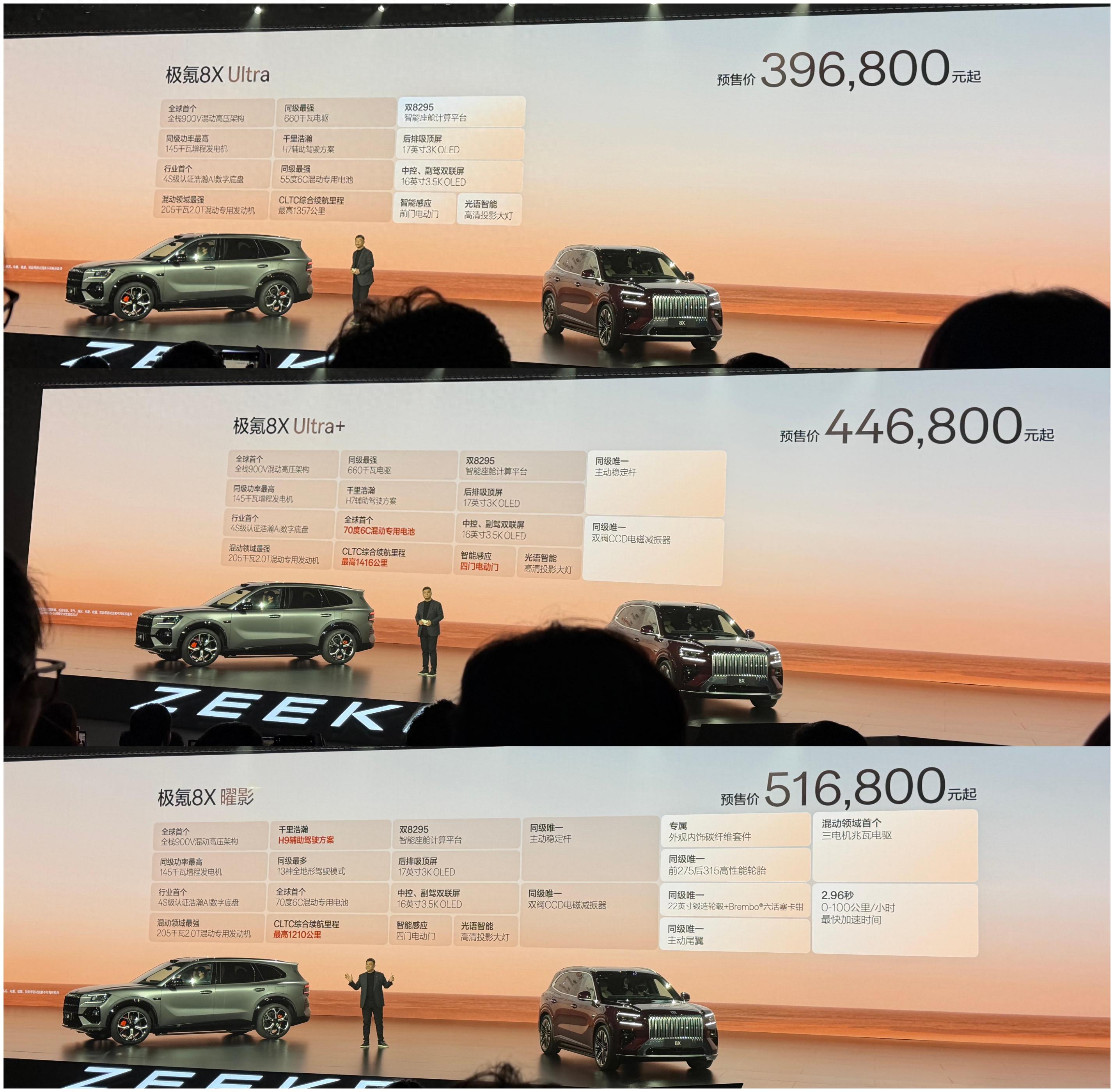 全新高性能大五座旗舰SUV极氪8X开启预售,预售价37.68万元起。曜影预售价为51.68万元起。