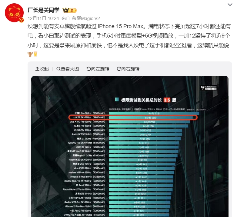 无独有偶,博主厂长是关同学在首销之前就公布了一加12的续航测试成绩,并惊讶的发现,一加12在满电状态下亮屏超过7小时仍然有点的表现,超过了 iPhone 15 Pro Max。而在小白评测公布的数据中,一加12经历5小时重度模型+5G视频播放,坚持了近9小时之后才自动关机,对此,博主厂长是关同学戏称“这要是拿来刷原神和崩铁,怕不是我人没电了这手机都还坚挺着”。