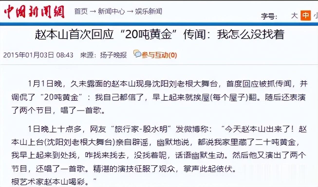 赵本山本人也曾在,沈阳刘老根大舞台亲自辟谣,幽默调侃说,自己回家翻遍了屋子,一两黄金都没找到,