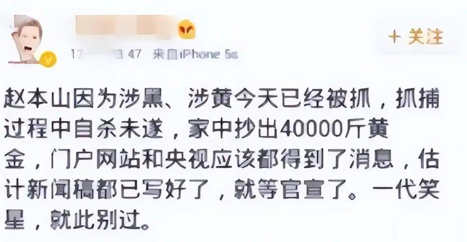 本山传媒也同步发布官方声明,明确表示被抓、藏黄金均为谣言,将依法追究造谣者的责任。