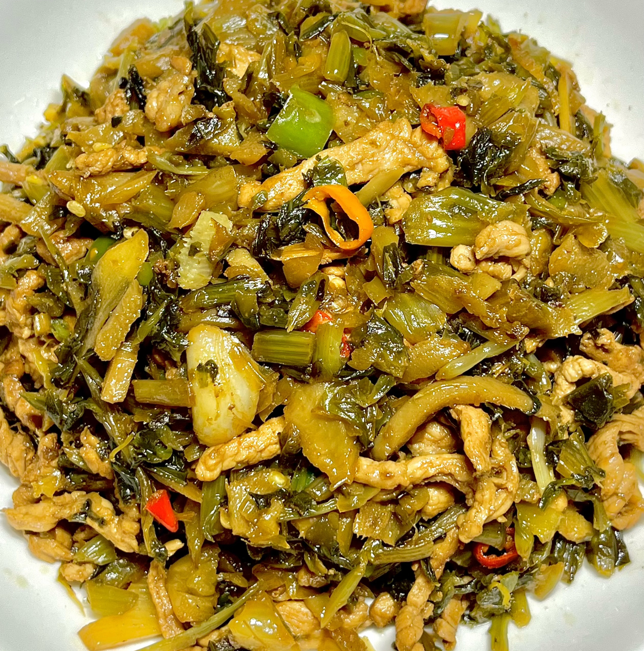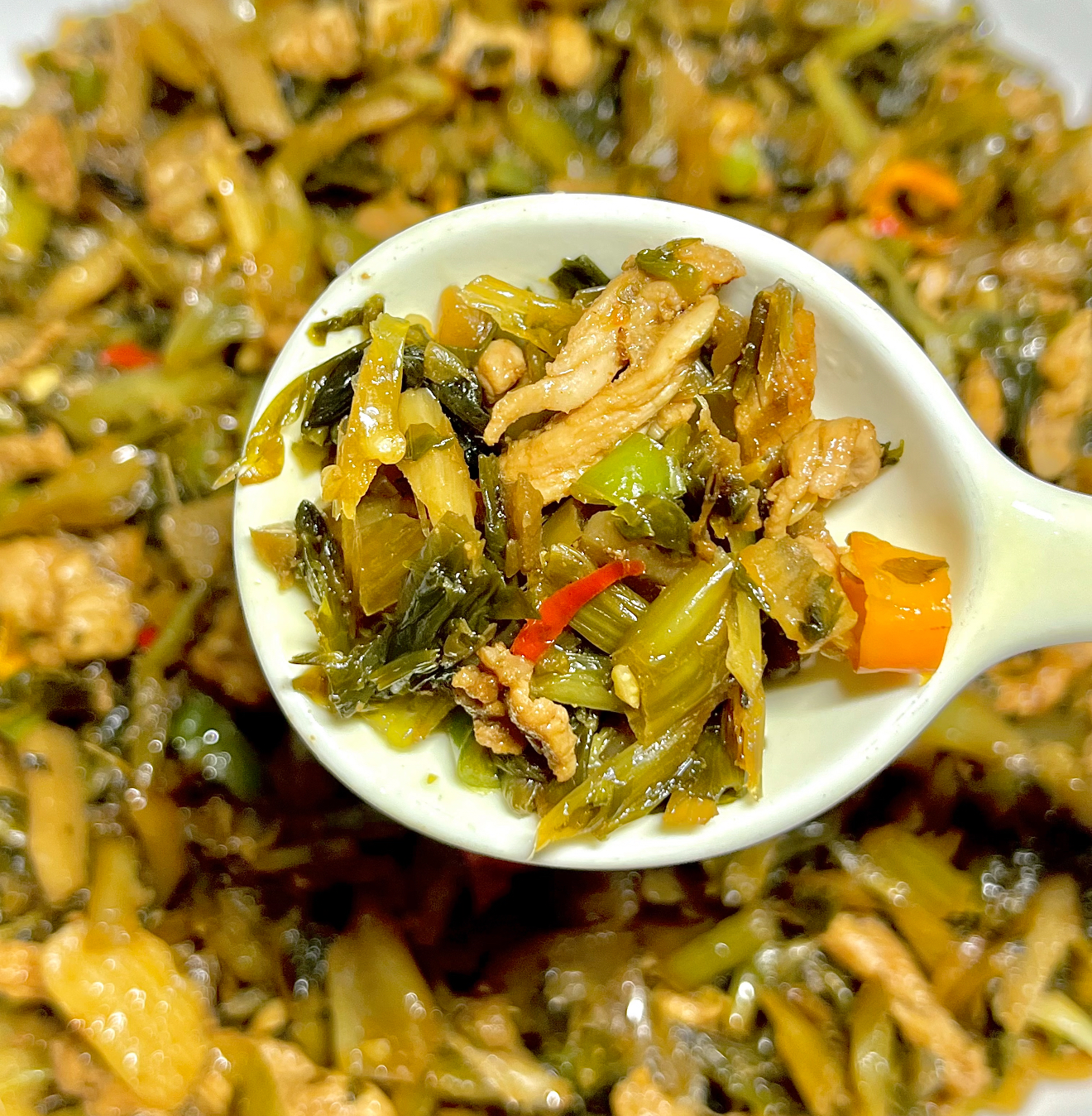 不用洗锅!利用剩下的猪油,开最大火把雪菜倒进去。这时候要像摇滚歌手般疯狂翻炒,让每根雪菜都裹上油光。当厨房弥漫着类似培根的焦香时,撒半勺白糖——这勺糖是点睛之笔,能中和雪菜的涩味。