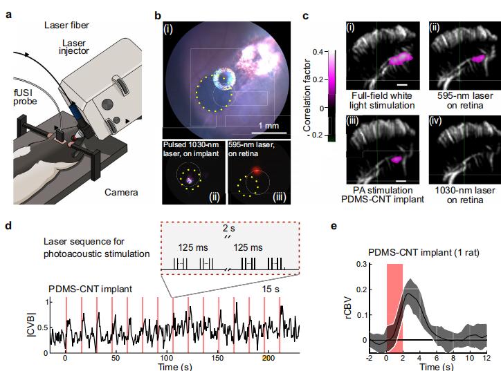 光声转化的本质是能量转化的物理过程:1,030 纳米波长的近红外激光经蜡烛烟灰的光吸收层转换成热能,然后再通过聚二甲基硅氧烷的热膨胀和收缩性能转化为频率约 42 兆赫兹的超声波脉冲,进而精准刺激尚能工作的视网膜细胞,最终在动物实验中实现了视觉信号向大脑的传递。