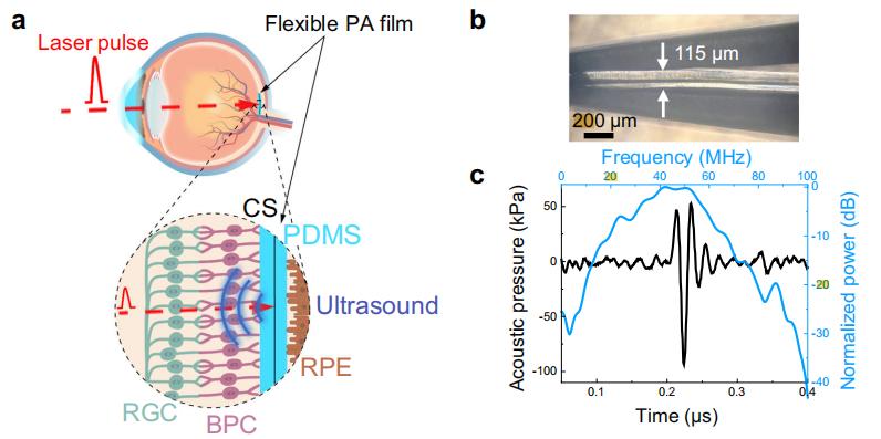 根据实验数据,这种薄膜的光声转换效率能实现每微焦耳激光能量产生 26 千帕的声压。经测试,在距离薄膜表面 0.9 毫米处的峰值声压为 146.2 千帕,这一强度“刚刚好”:既能激活视网膜神经回路,又显著低于传统超声换能器刺激视网膜所需的声压。