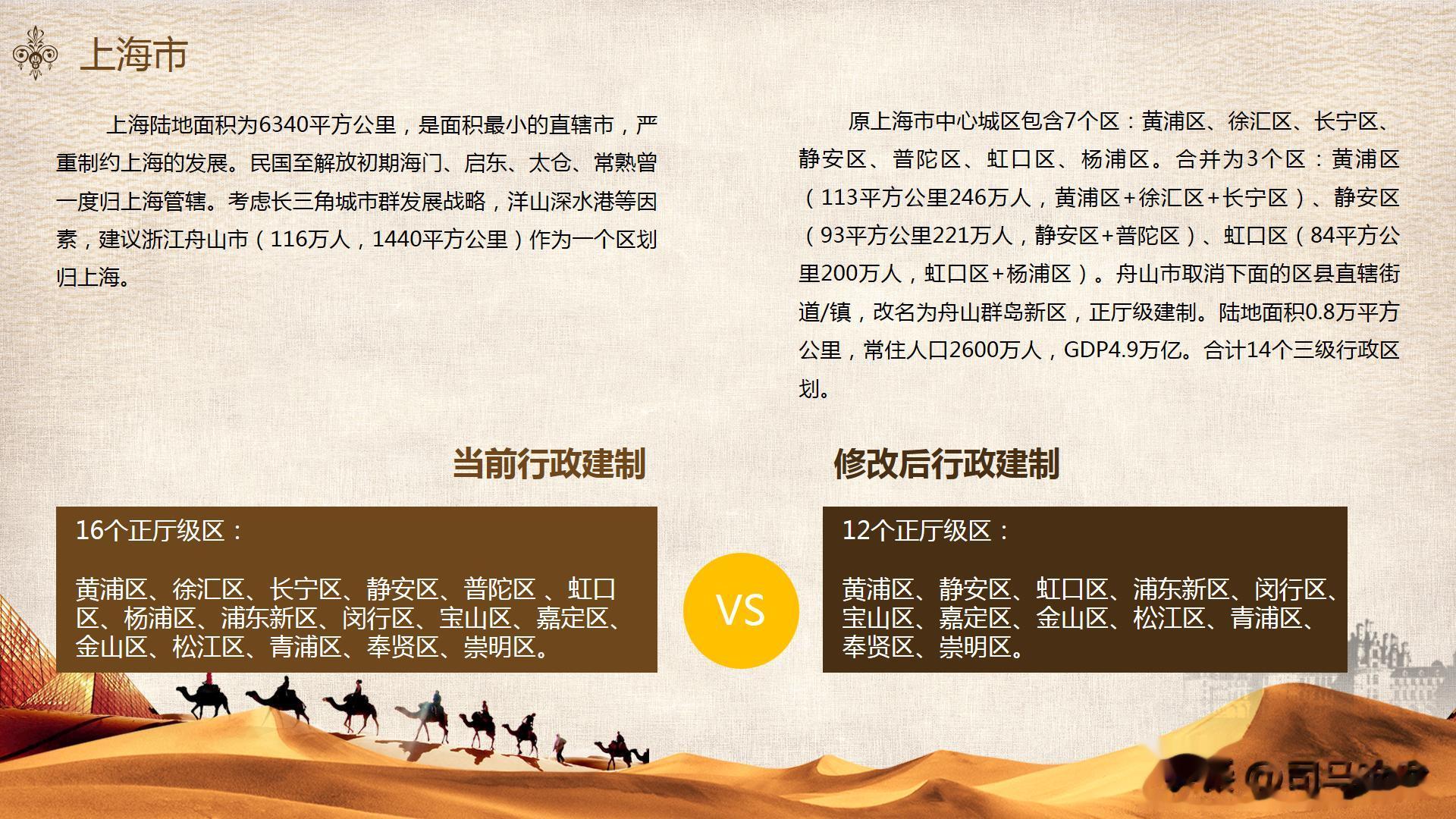 这样合并后由原来的16个区变成了12个区,减少了4套厅级行政班子。其实上海还是太小了,考虑长三角城市群发展战略,洋山深水港等因素,建议浙江舟山市(116万人,1440平方公里)作为一个区划归上海。