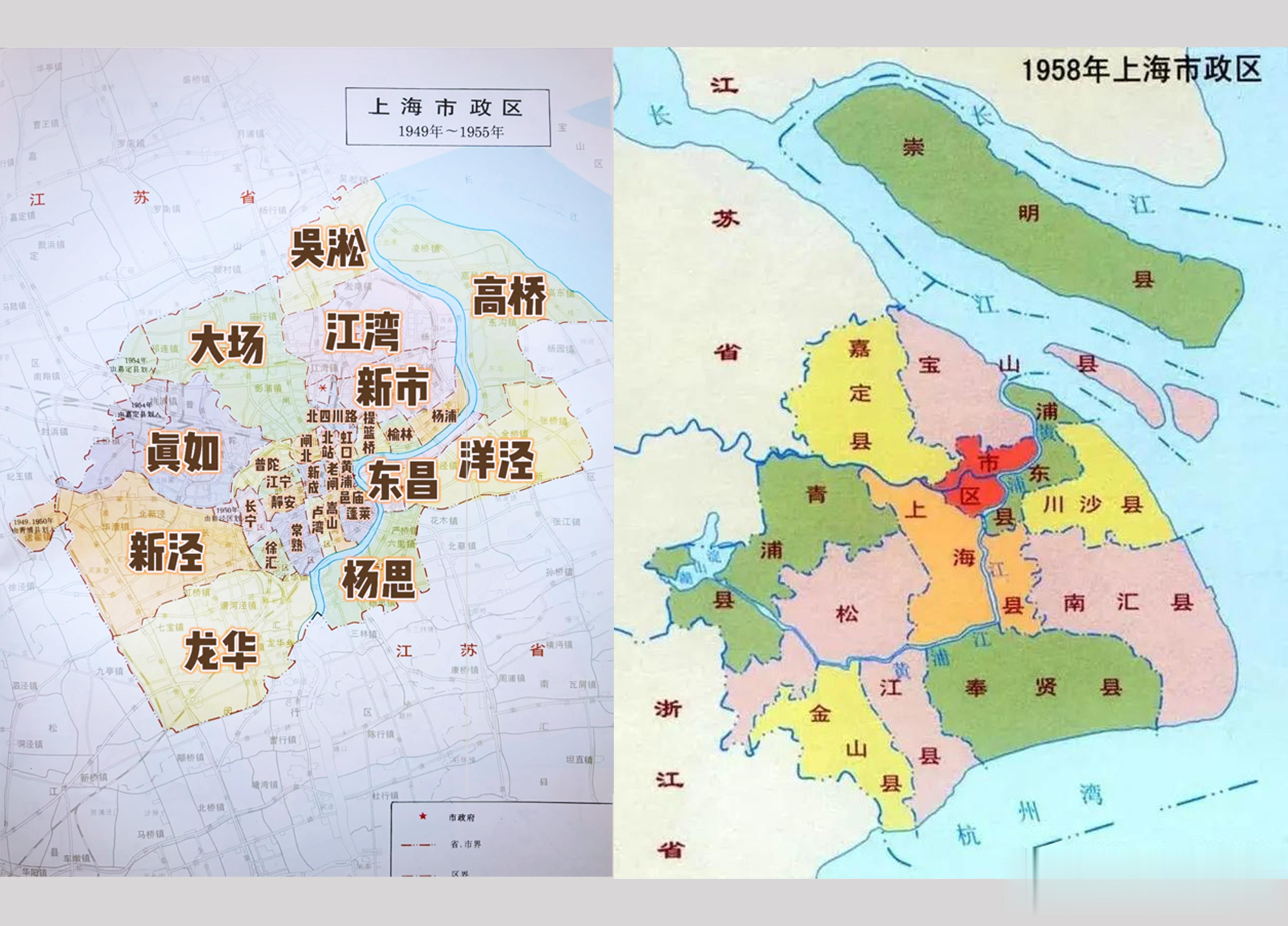 民国期间海门、启东、太仓、常熟曾一度归上海管辖。建国初期上海仍为中央直辖市,划分为20个市区和10个郊区。1956年经过行政调整,上海市辖区减为18个,辖15个市区和3个郊区。