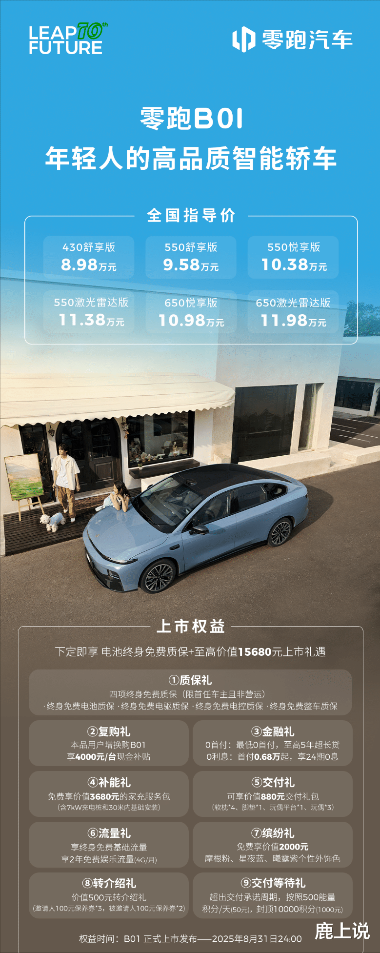 上市权益方面,B01正式上市发布至2025年8月31日24点,用户通过零跑官方 APP、小程序及官网支付5000元定金完成定购,即可享受以下权益: