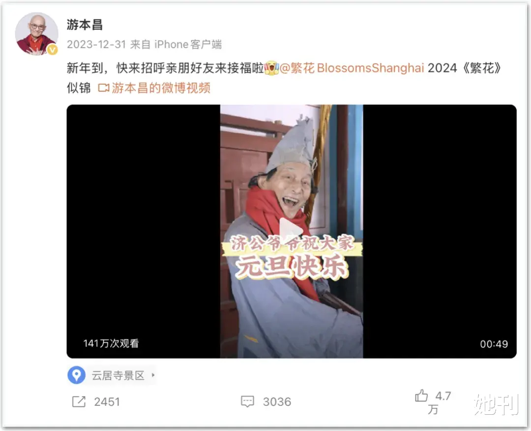他在微博上称呼粉丝为“娃娃们”,带着一种长辈的慈祥和亲切,逢年过节都会上来问候大家,特别是新年,老爷子会特意换上“济公”的皮肤,去到北京的云居寺,敲钟送祈福。