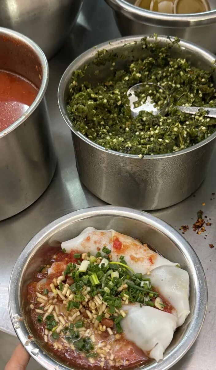 是我最想念的美食小吃了,薄薄的米皮里包裹着瘦肉、酸萝卜等配菜,口感软糯丰富,酸辣酱香。