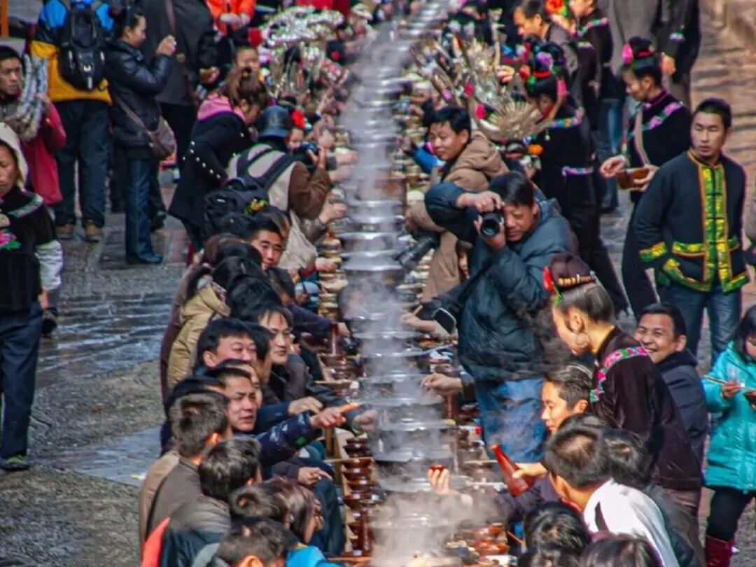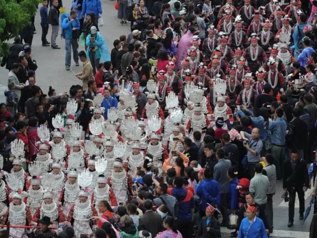 盛装出席的苗族姑娘,以优美的敬酒歌声,以“高山流水”礼仪,向宾客展示苗族最精彩的待客之道。